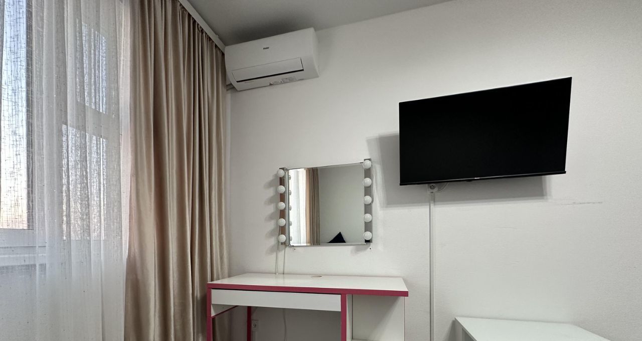 В комнате большой, комфортный диван, шкаф и тумбы для хранения одежды и личных вещей, туалетный столик, зеркало с подсветкой, телевизор, кондиционер.