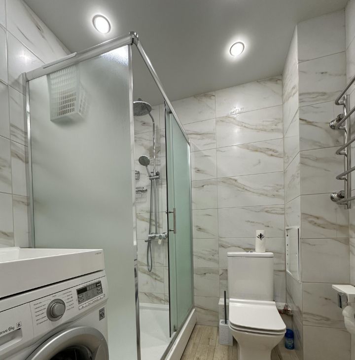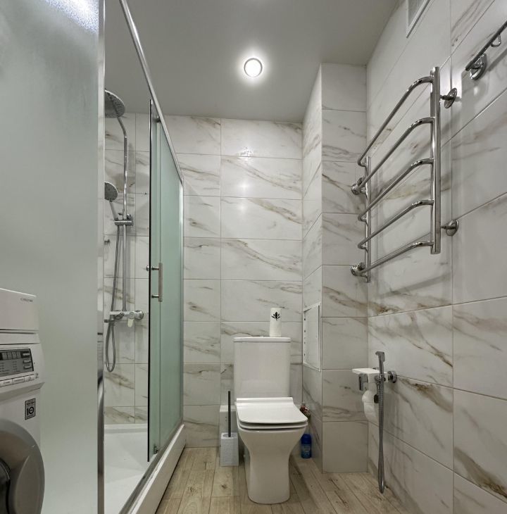Ванная комната в современном кафеле, установлена душевая кабина, новая сантехника, смесители, гигиенический душ.