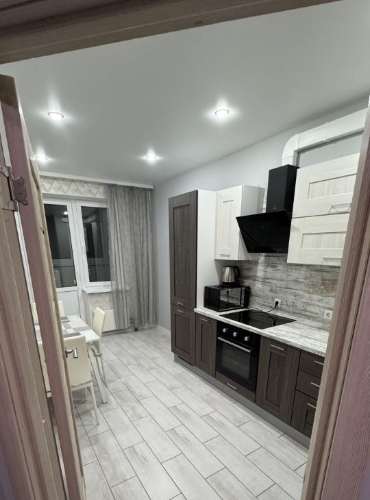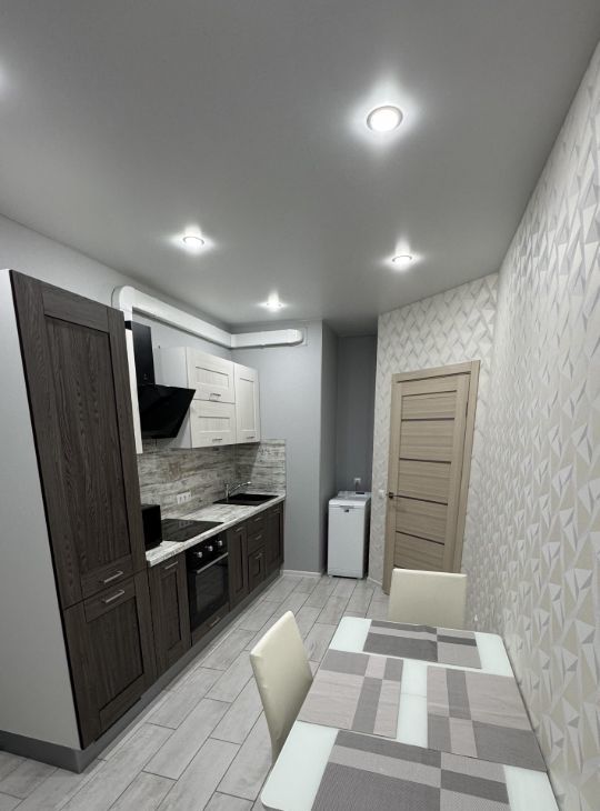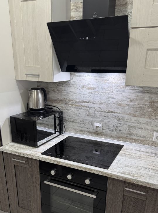 Кухня: cтиpaльная машина, встроенный холодильник с морозилкой, электроплита с 4 комфорками, микроволновая печь, вытяжка, обеденный стол с 3 стульями.