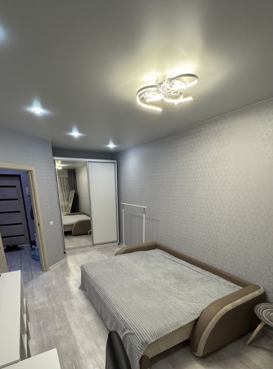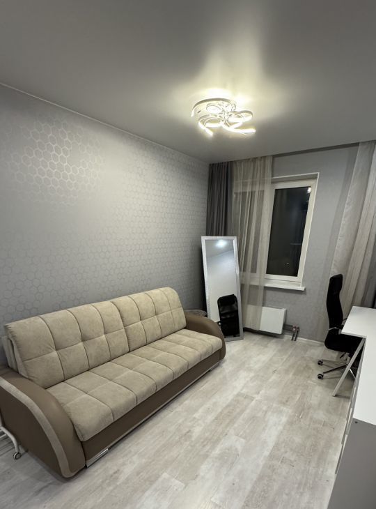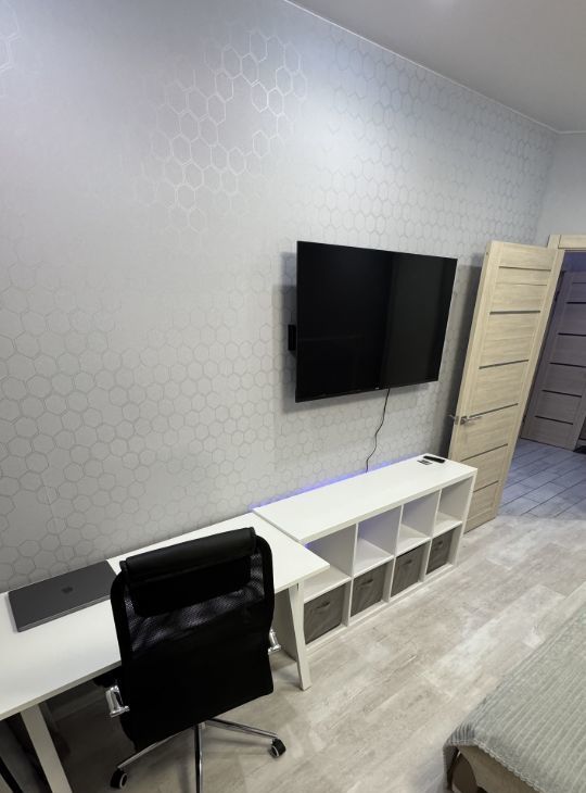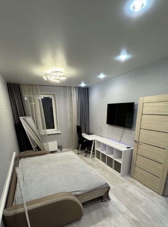 Комната: тeлeвизор 50 дюймов со смарт тв, 2-х спальный диван, шторы блэк-аут в пол, шкаф купе с зеркалом, наполное зеркало, рабочий стол со стулом, стеллаж и кофейный столик.