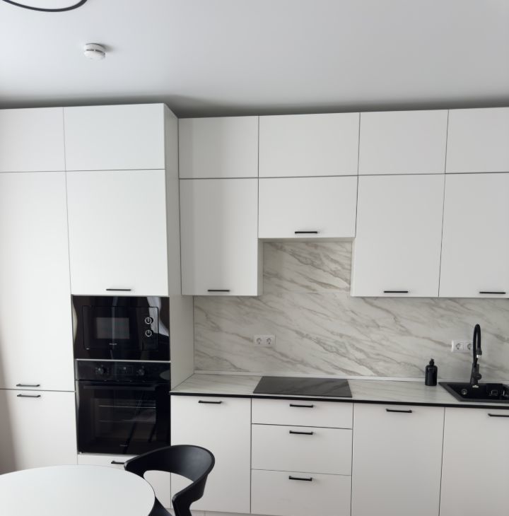 Кухня: холодильник No Frost, микроволновая печь, духовой шкаф, электрическая плита, обеденный стол и 4 стула, телевизор.