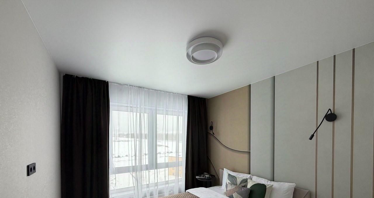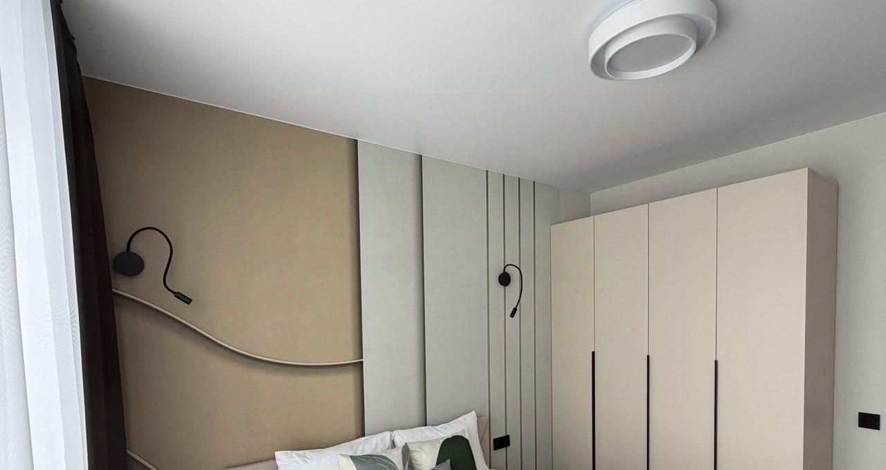 Уютная спальня с большим окном и шторами блэкаут обеспечит комфортный сон в любое время суток. Вместительный шкаф и продуманное освещение создают ощущение уюта и порядка.