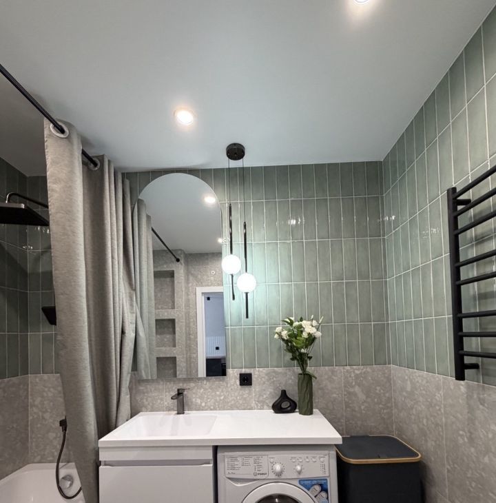 Современная ванная комната с дизайнерской отделкой, тропическим душем, ванной, зеркалом с подсветкой и стиральной машиной — комфорт продуман в деталях.