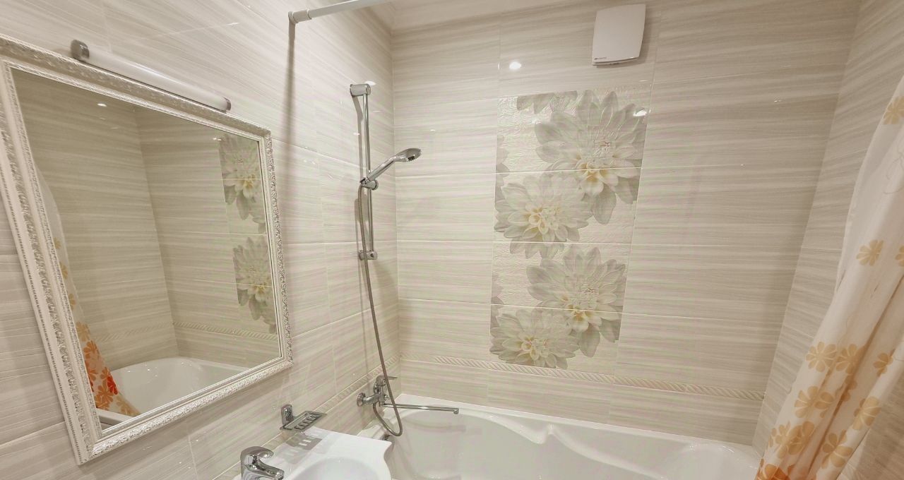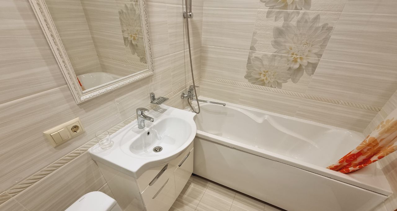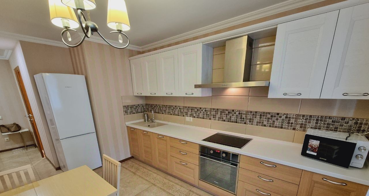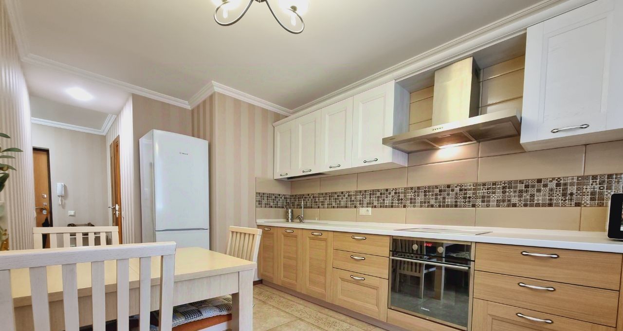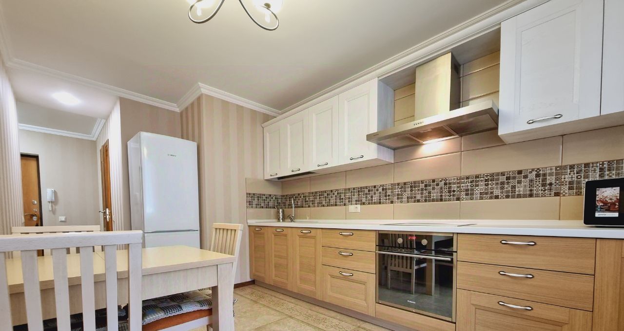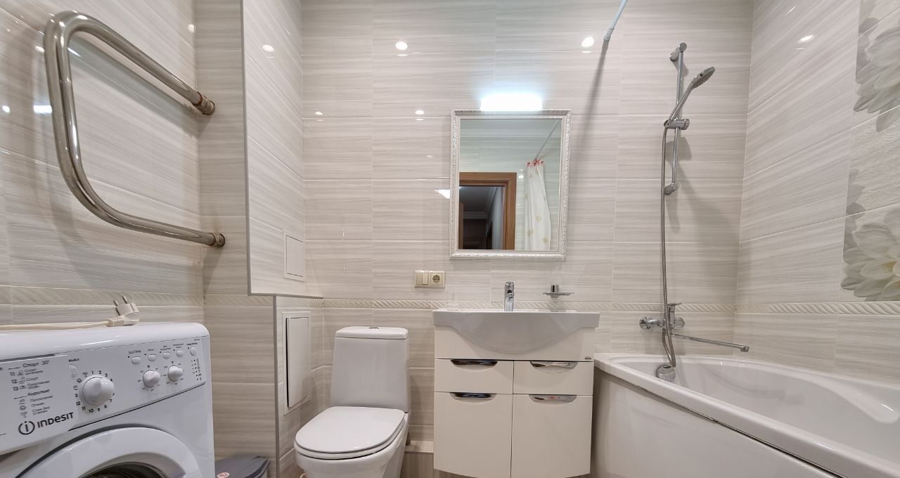 Есть гардеробная комната в прихожей. Кухня светлая и функциональная, оснащена всей необходимой техникой, включая холодильник и микроволновку. Ванная комната совмещенная, с современной сантехникой и стиральной машиной.