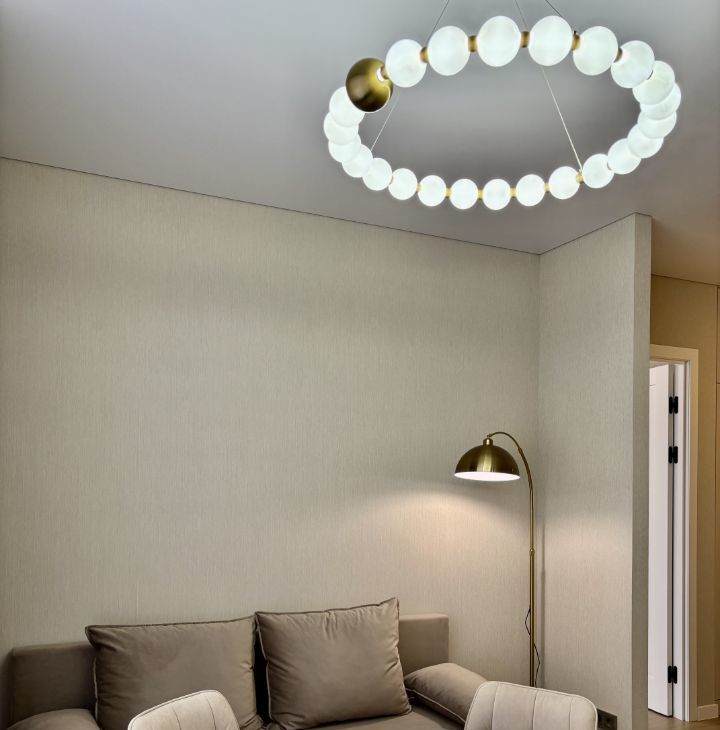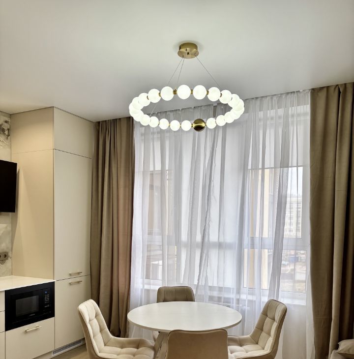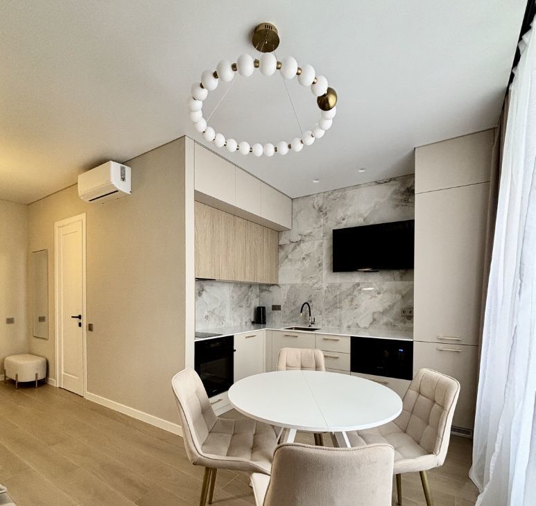 - Обеденная зона оснащена стильным круглым столом с удобными стульями и диваном.