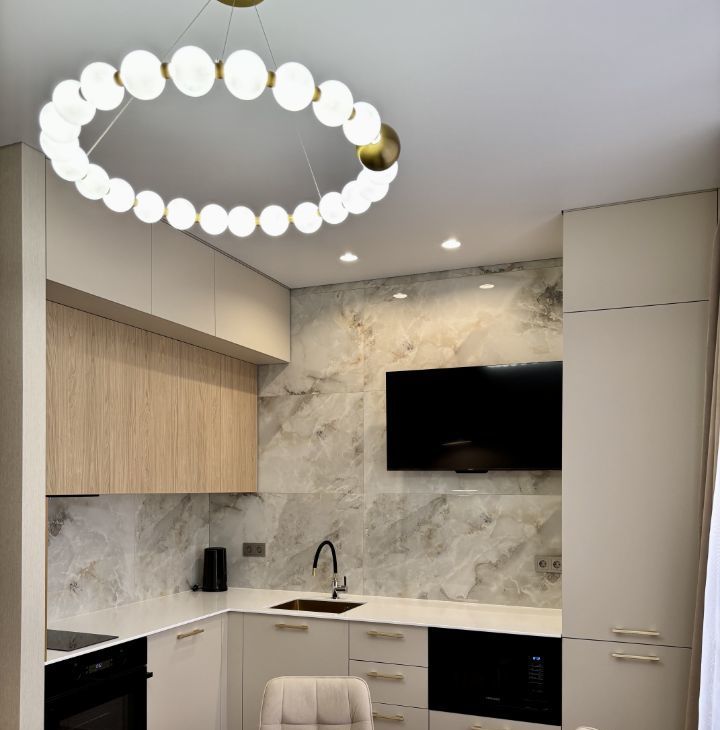 - Кухонный гарнитур со всей встроенной техникой (холодильник, духовка, плита, СВЧ, посудомоечная машина) и полным кухонным набором (Тарелки, столовые предметы, кастрюлю, сковородки, стаканы).