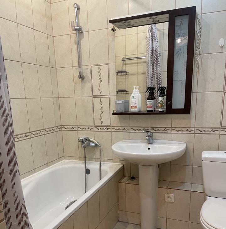 Жилая площадь составляет 21 кв.м, кухня — 10.5 кв.м, где есть вся необходимая мебель и техника. В вашем распоряжении кондиционер, холодильник, телевизор и стиральная машина. Санузел совмещенный, есть ванна. Высота потолков 2.6 метра, что добавляет ощущение простора. Лоджия позволяет наслаждаться свежим воздухом и видом на улицу.