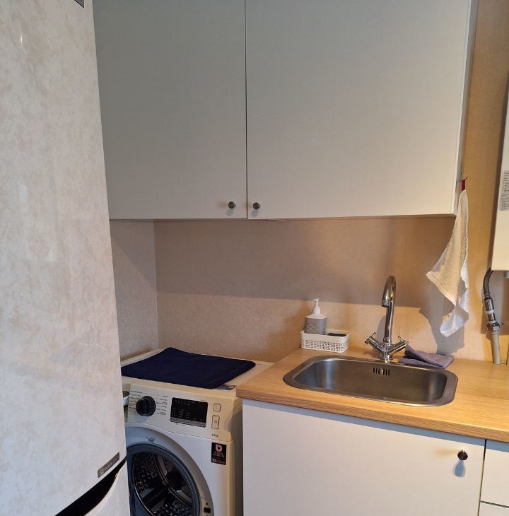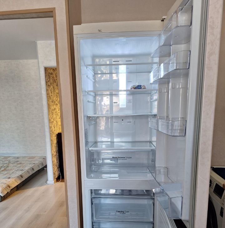 В квартире есть все для комфортного проживания: холодильник, стиральная машина, чайник, утюг, сушилка, гладильная доска, шкаф, полки с ячейками для хранения.