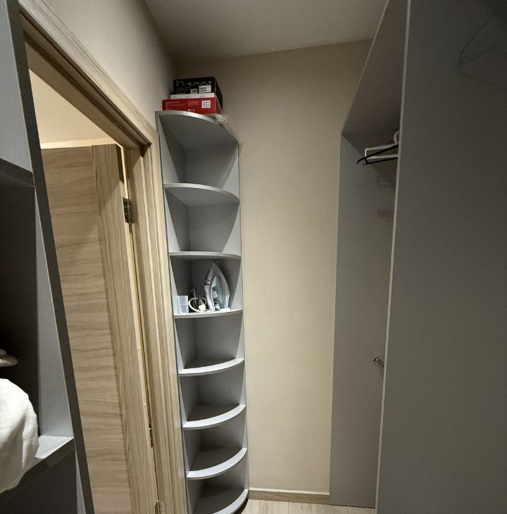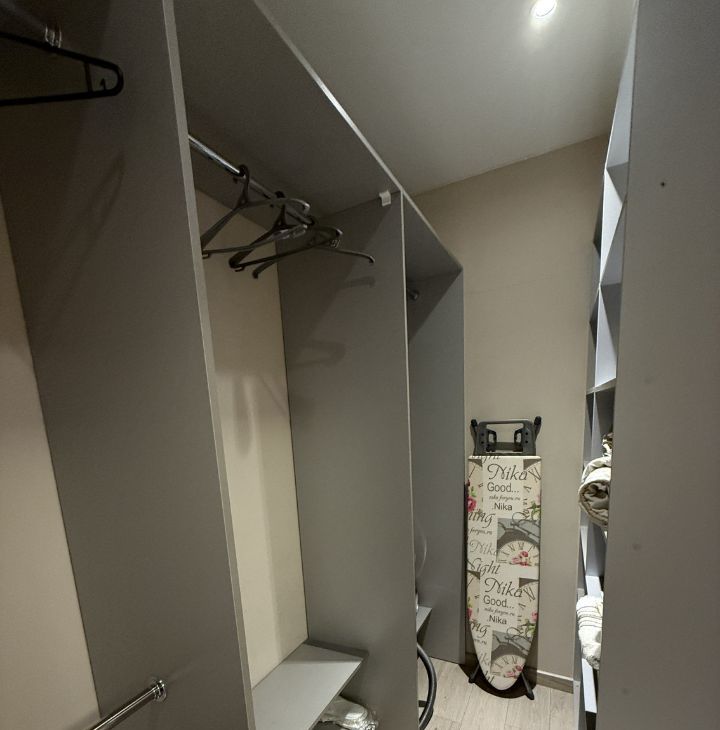 Имеется гардеробная, утюг, гладильная доска и сушилка.