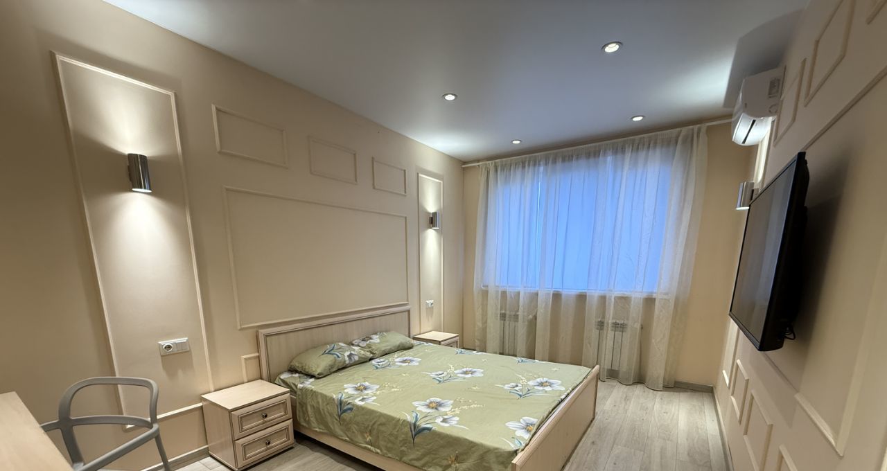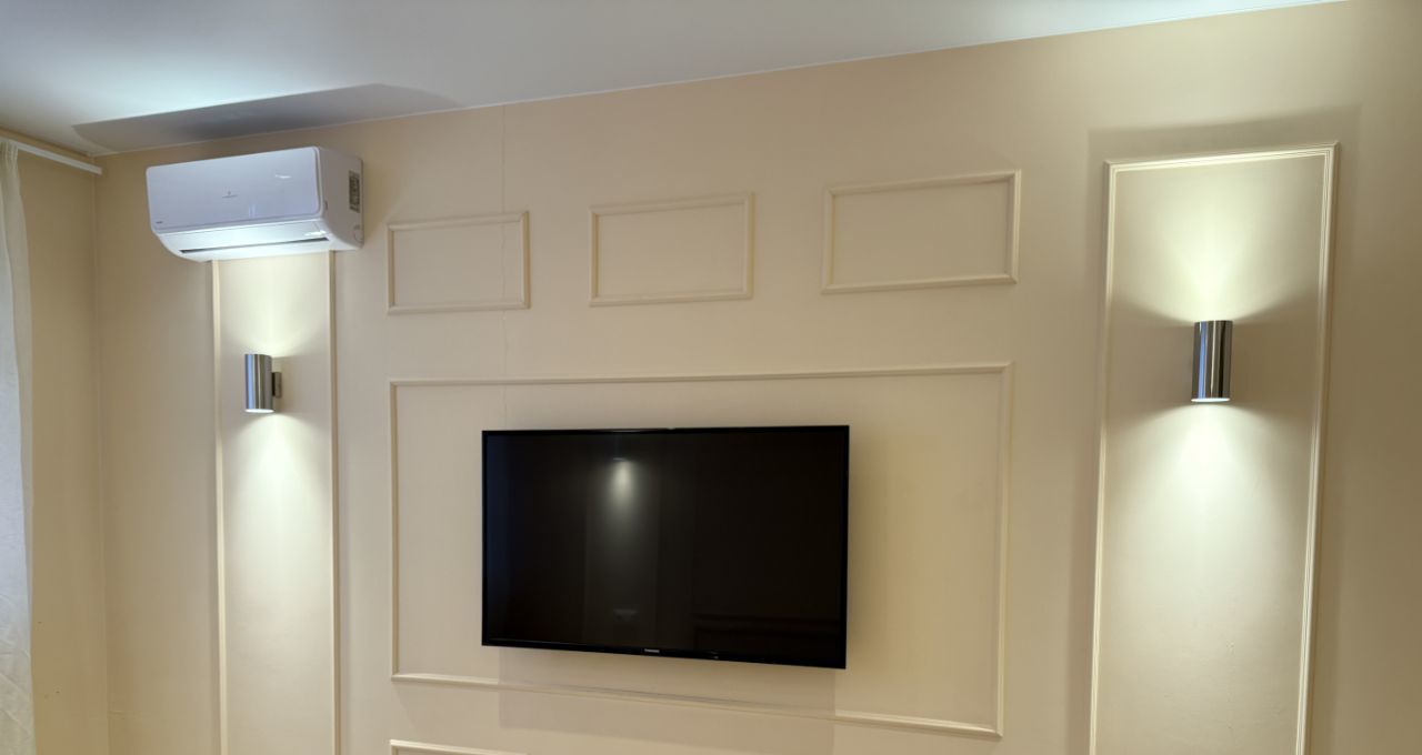 Кухня оборудована современной техникой: холодильник, плита, духовой шкаф и микроволновая печь, телевизор. В комнате установлен кондиционер и телевизор.