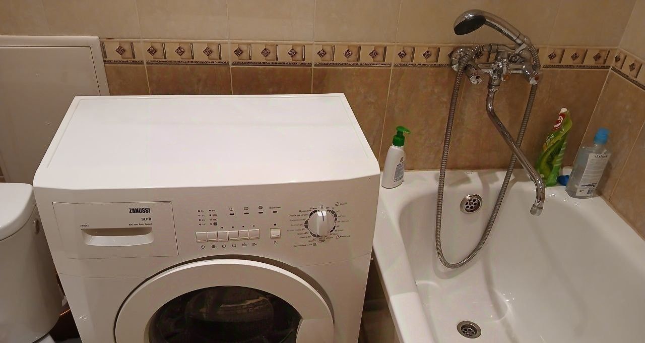 Санузел совмещенный, оснащен ванной и стиральной машиной.