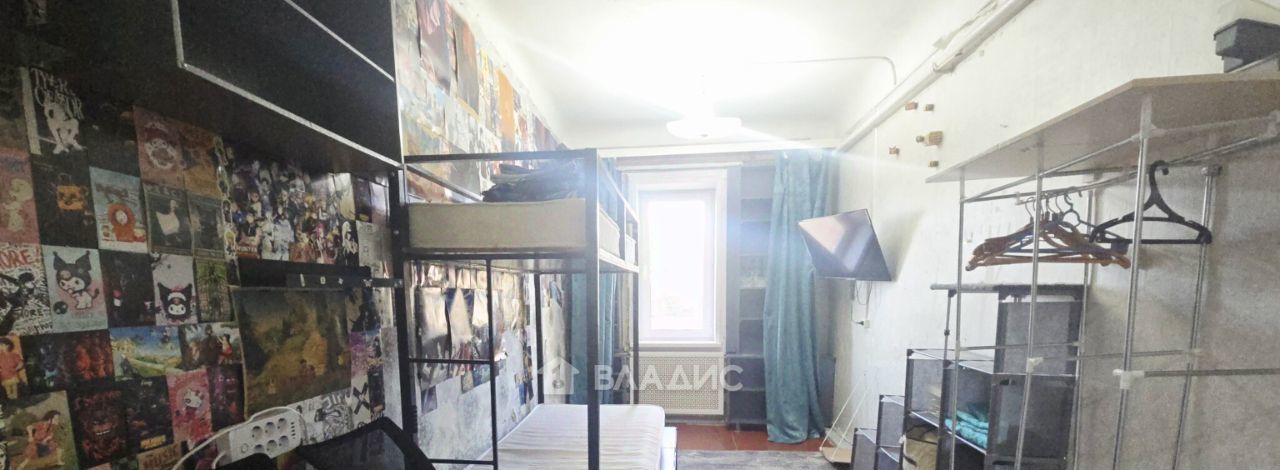 Комната, кухня, санузел, душевая. В комнате система хранения, стеллажи, стол, кровать двух-ярусная.