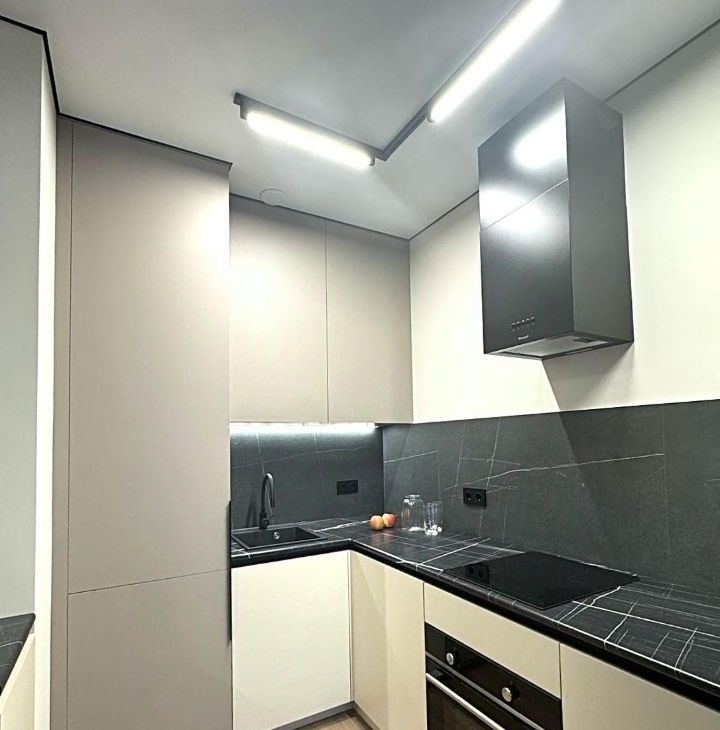 - современная кухня со встроенной техникой (индукционная панель, духовой шкаф, микроволновка, посудомоечная машина, двухкамерный холодильник);