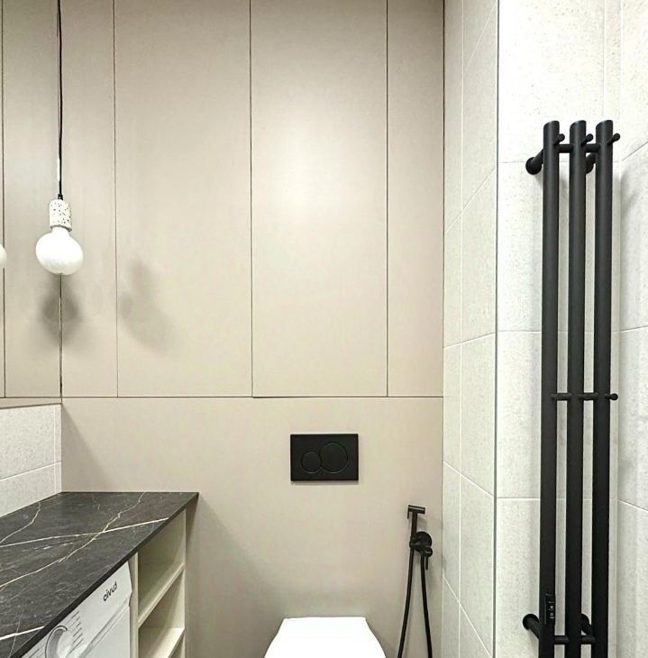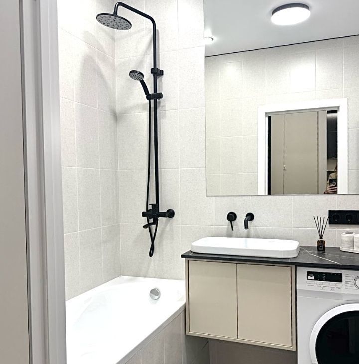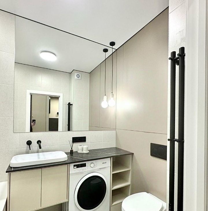 Совмещённый санузел с ванной 180 см, инсталляцией с подвесным унитазом, стиральной машиной и системой хранения. Большое зеркало с подсветкой усиливает ощущение простора.