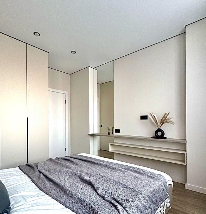 Полноценная зона отдыха с кроватью 160*200 см, ортопедическим матрасом и вместительным шкафом. У окна оборудована рабочая зона — идеально для удалённой работы.
