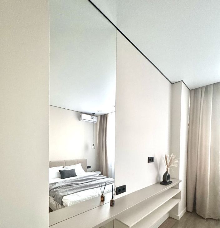 Встроенный вместительный шкаф и зеркало с подсветкой во всю высоту.