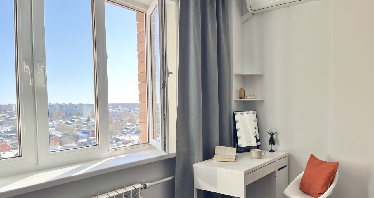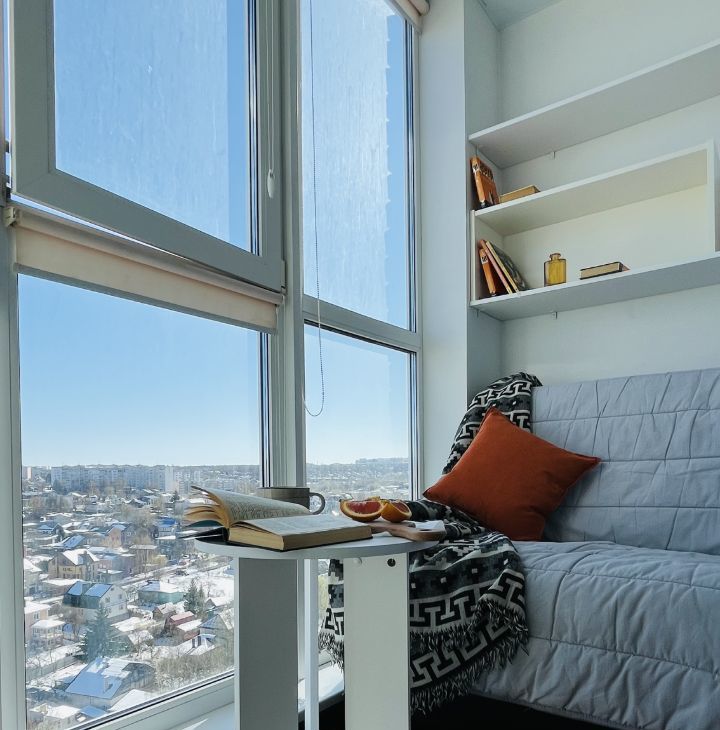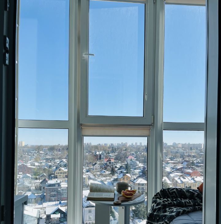 Выход на лоджию с тёплым полом — место для утреннего кофе с великолепным видом на речку Старку и частный сектор. Никаких соседских окон напротив.
