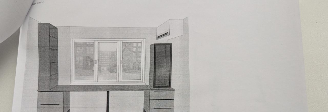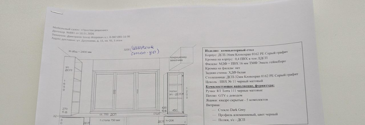 В течение месяца будет установлен стол, сделанный на заказ во всю стену с фасадами из МДФ-панелей, с доводчиками на ящиках и стеклянной панелью в шкафчике.