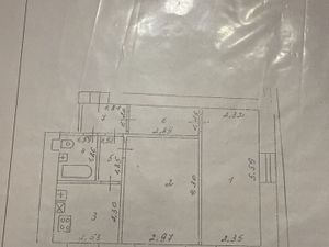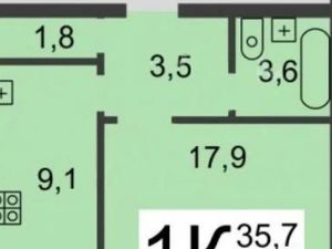 Общая площадь 33,1 кв.м, прихожая 6 кв.м.,кухня —5,95 кв.м, зал 17.4кв.м.