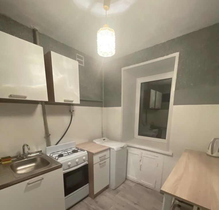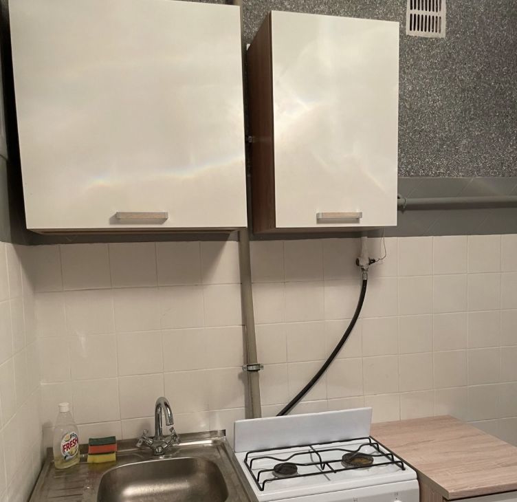 Кухня компактная, оборудована газовой плитой и раковиной с кухонным гарнитуром.