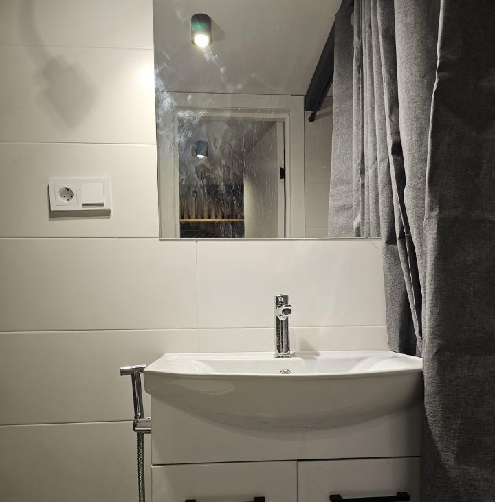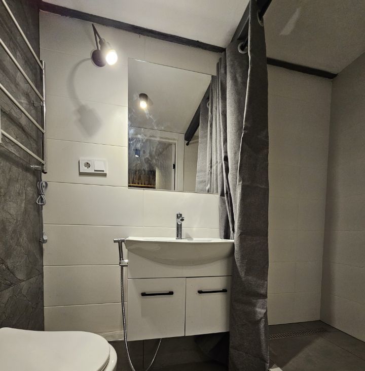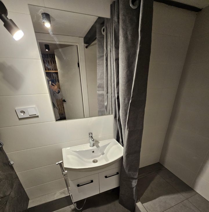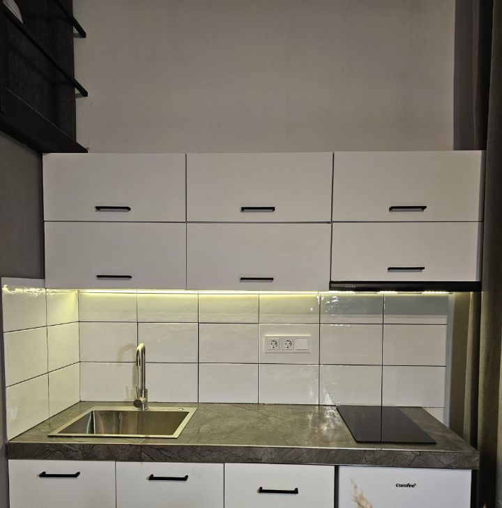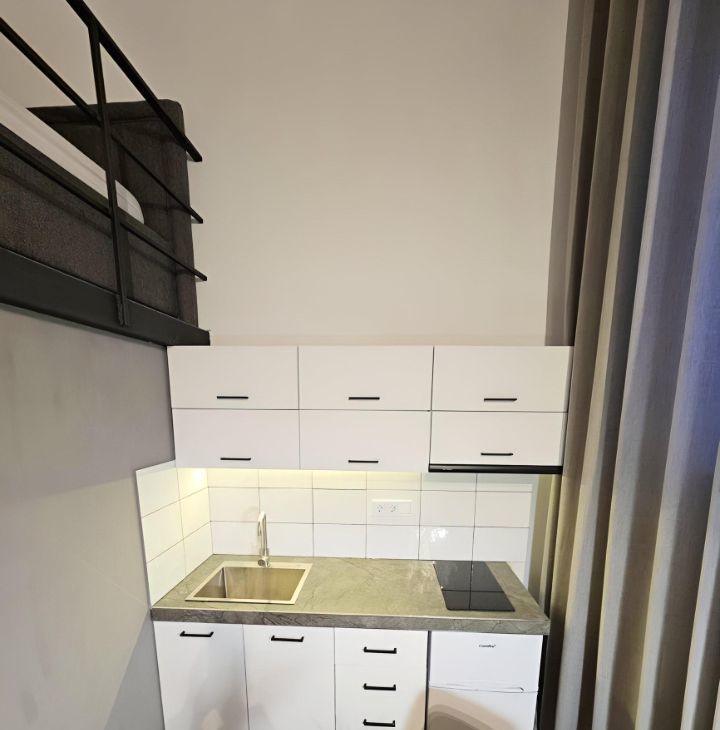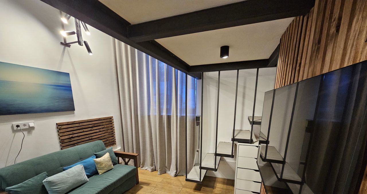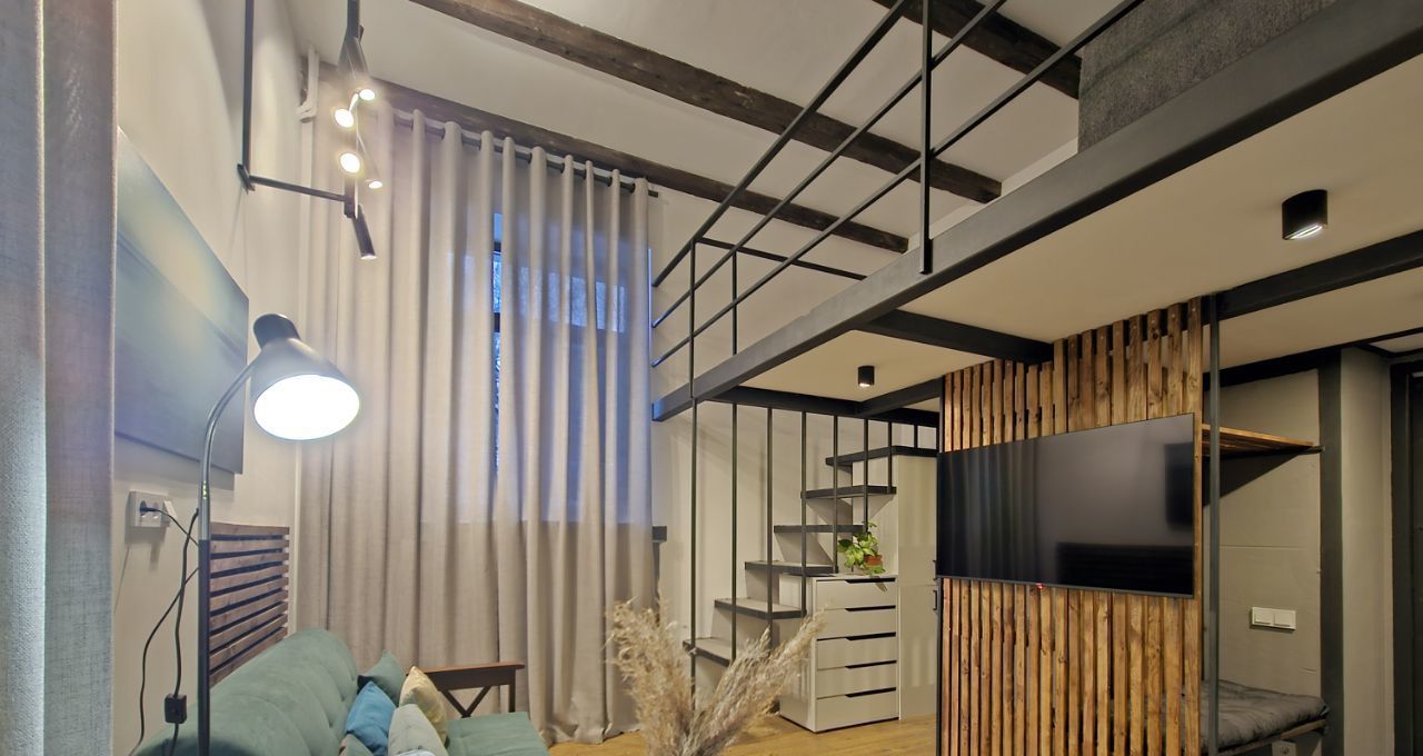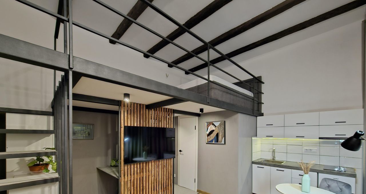 Ремонт выполнен по индивидуальному дизайн-проекту, благодаря нестандартной высоте потолков получилось реализовать 2 уровня в квартире. Соответственно на первом уровне получилась кухня-гостиная и санузел, на втором - спальня. Установлена новая мебель и бытовая техника.