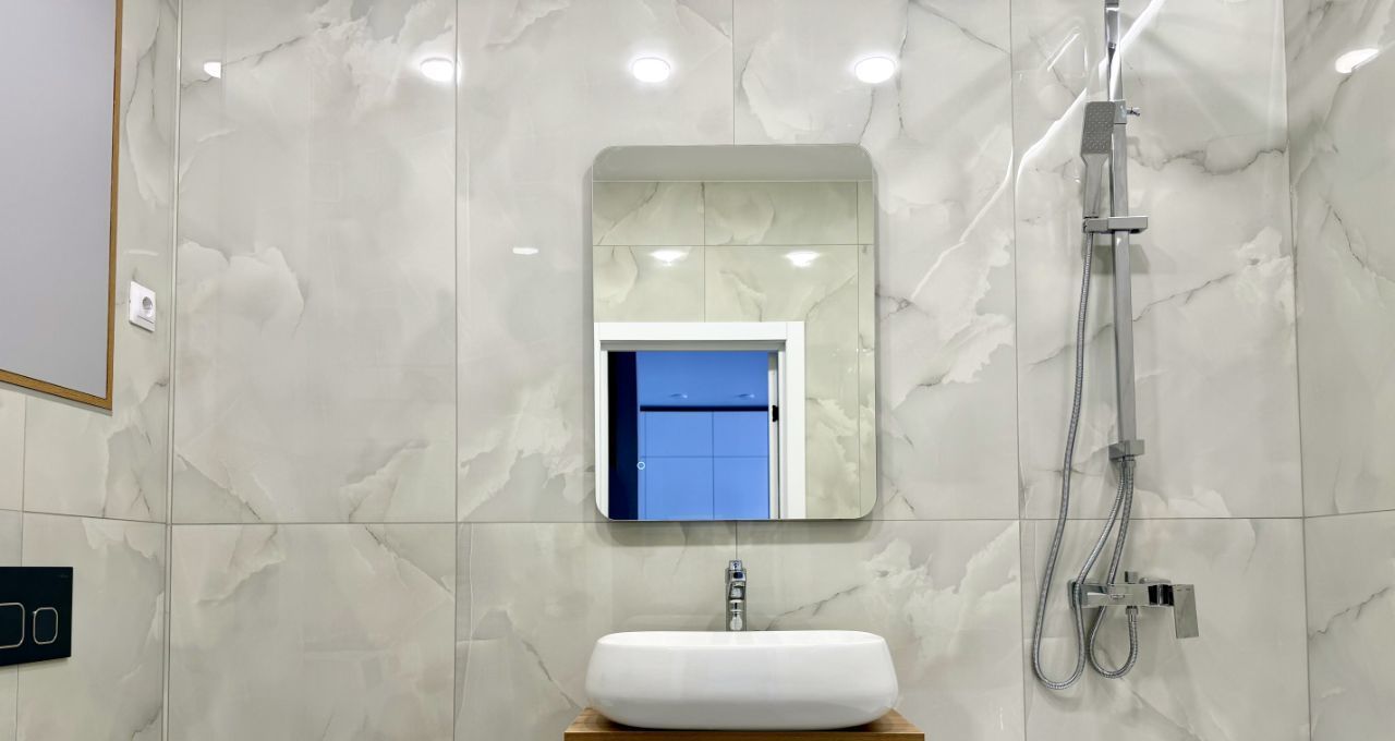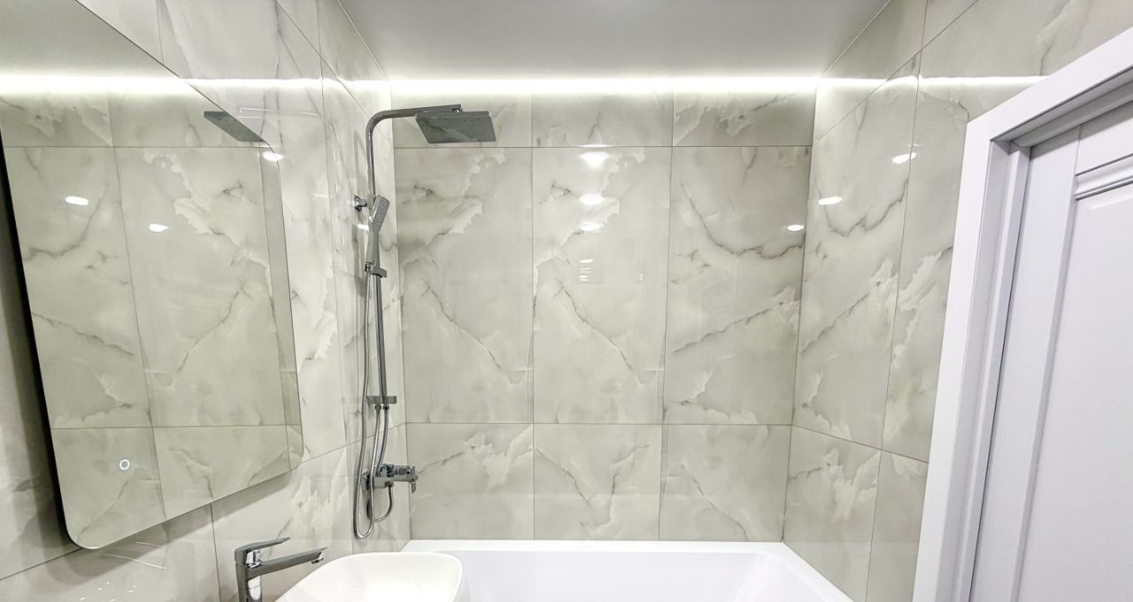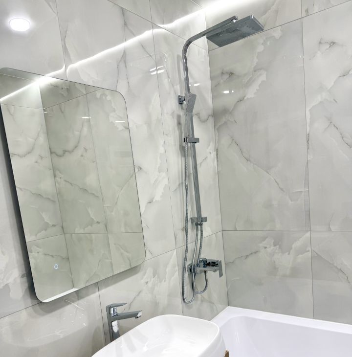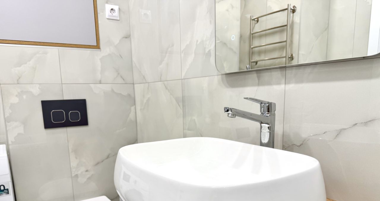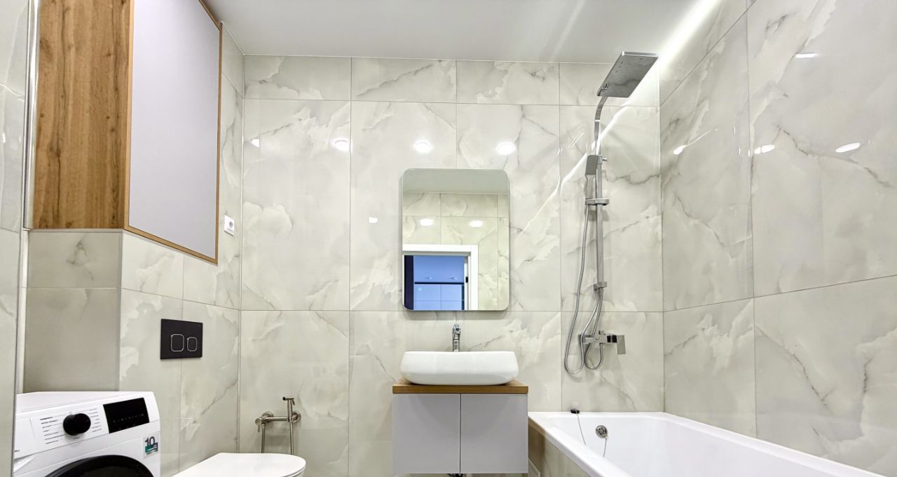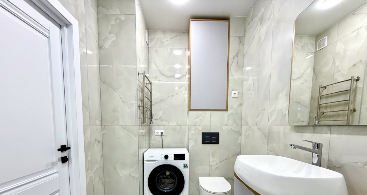 Санузел совмещенный, выполнен в современном стиле с качественной сантехникой и стиральной машиной.