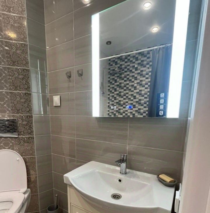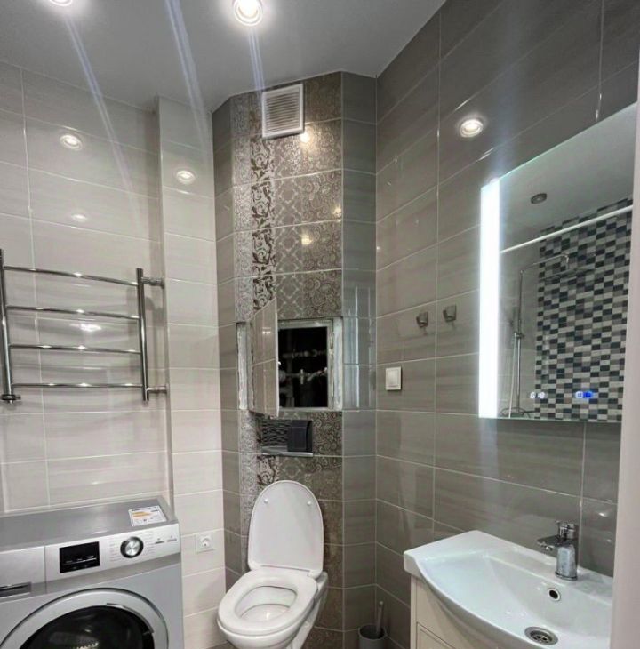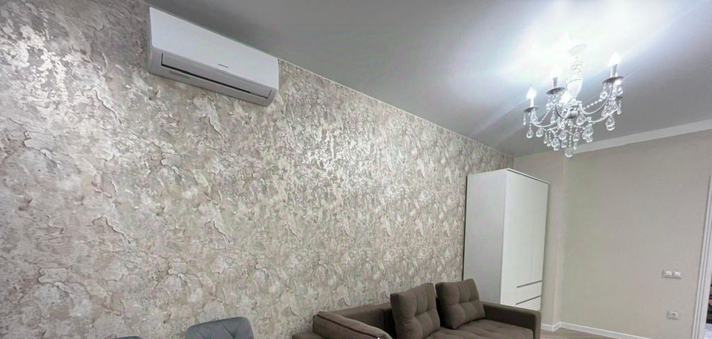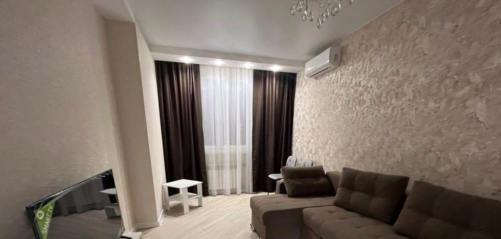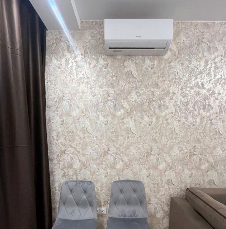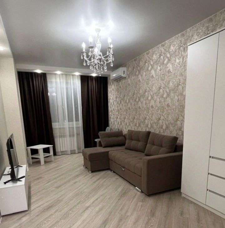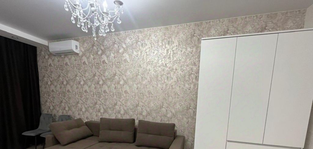 Квартира с новым современным ремонтом. В комнате раскладной диван, шкаф, тумба, телевизор, кондиционер. На кухне кухонный гарнитур, холодильник, эл.индукционная плита, стол, стулья. Вся техника и мебель новая. Выход на лоджию с кухни. Санузел совмещенный. Ванна новая, вся сантехника новая. В прихожей встроенный шкаф.