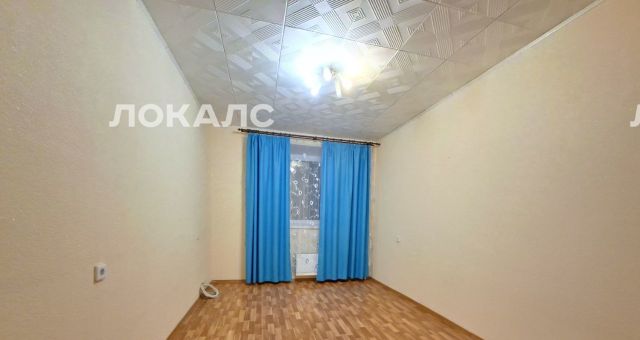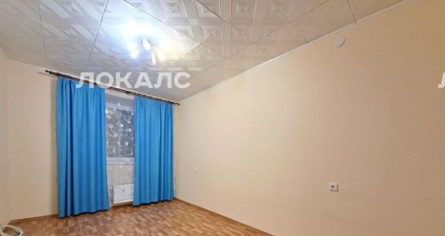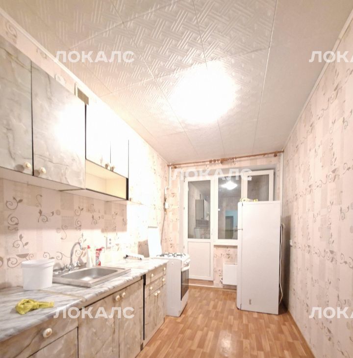 В квартире есть кухонный гарнитур, холодильник, плита и шкаф. Комната пустая.