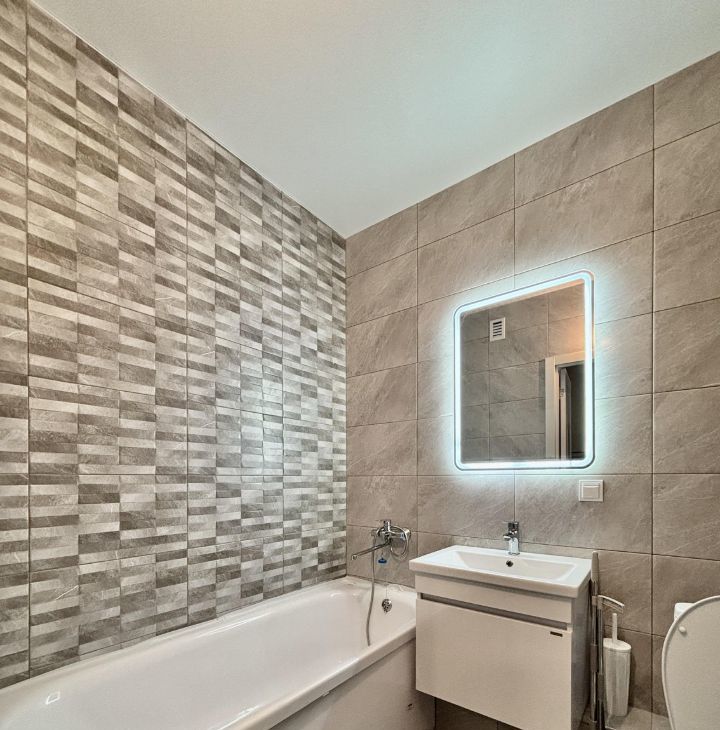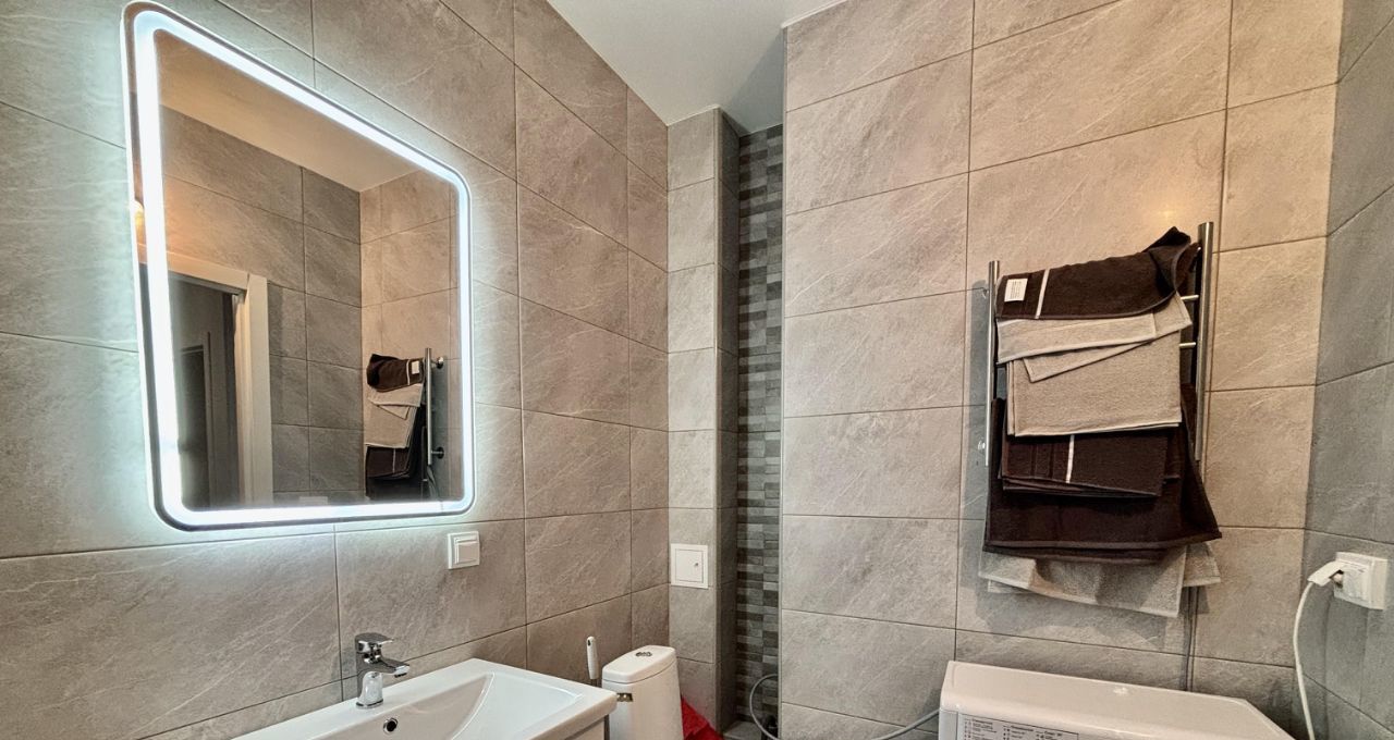 Квартира оборудована всей необходимой техникой и мебелью: холодильник, микроволновая печь, стиральная машина, плита, кровать, шкаф, диван. В санузле современная сантехника и большая ванна.