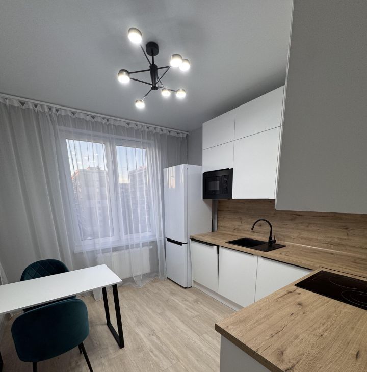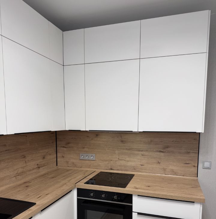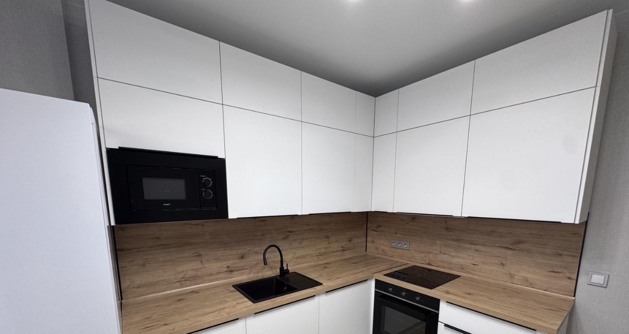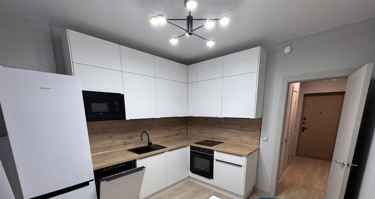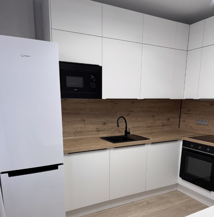 Кухня оснащена встроенной техникой : холодильник, варочная панель, духовой шкаф, посудомоечная машина, вытяжка.