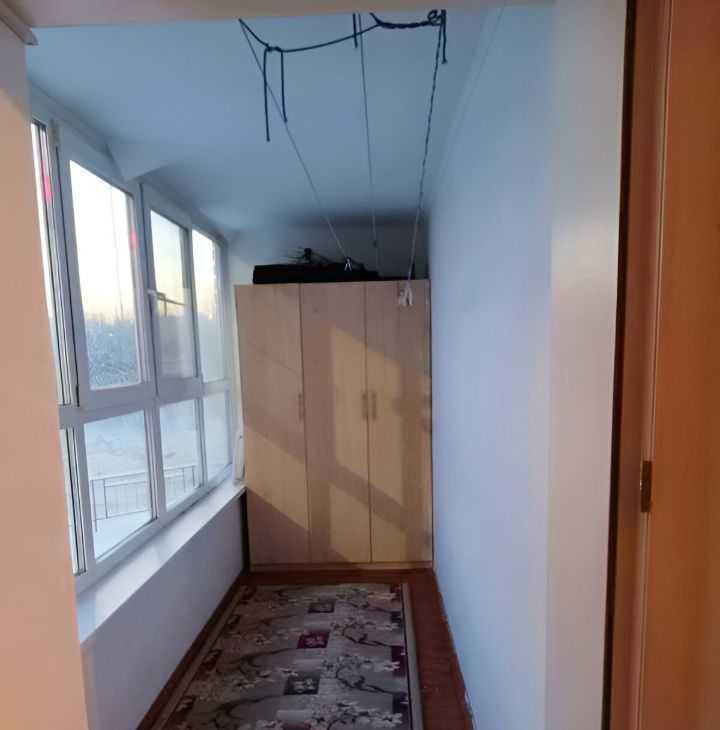 В комнате 2 больших дивана, из техники есть холодильник, стиральная машинка, телевизор, кондиционер. Большая гардеробная заменяет шкафы.