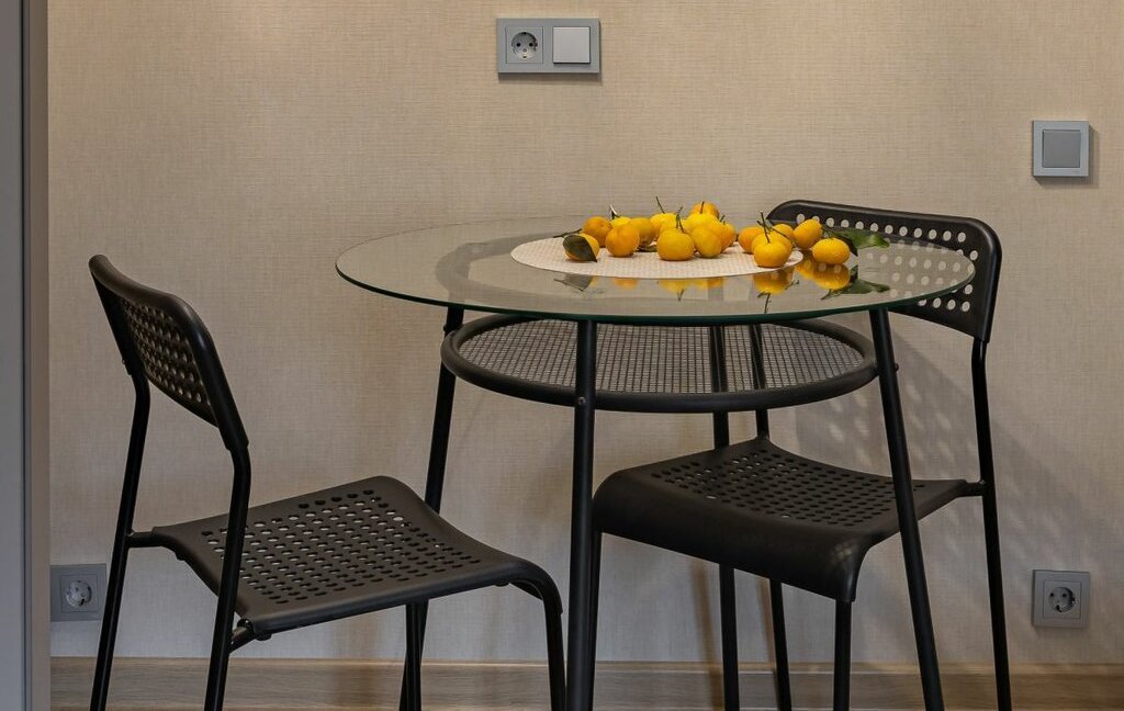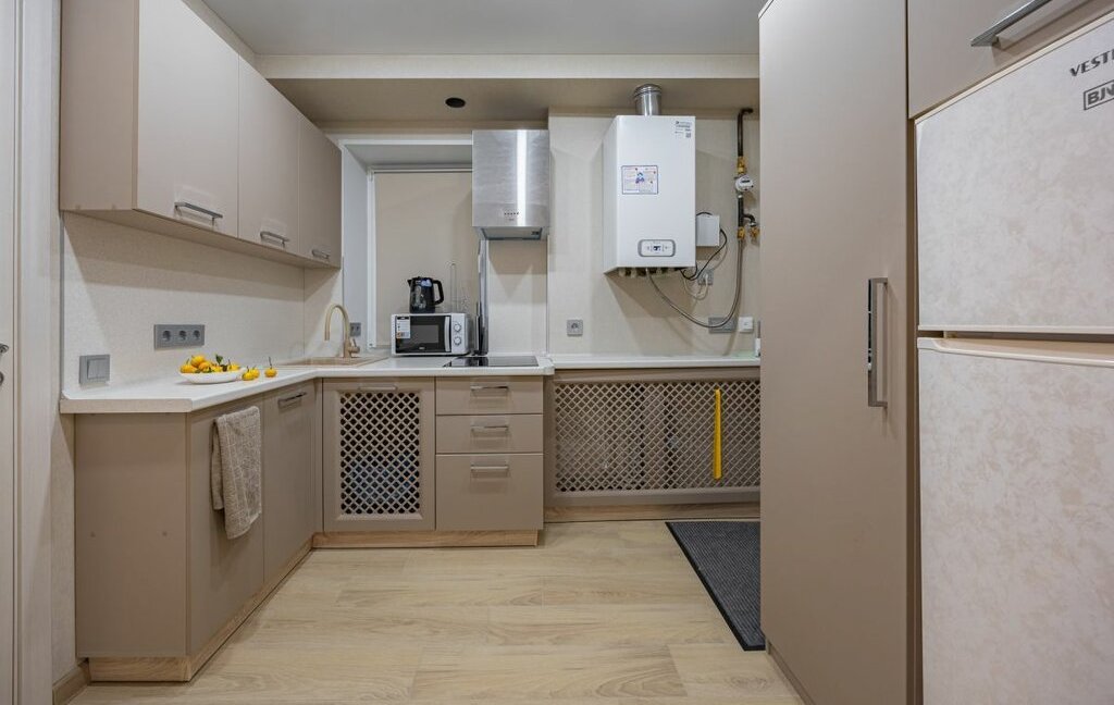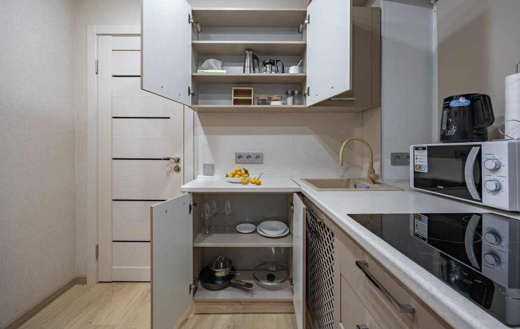 - Функциональная кухня: вся посуда, техника. Чайник, большой холодильник, микроволновая печь, плита, набор сковородок и кастрюль, столовые принадлежности, приборы, тарелки, бокалы, чашки.