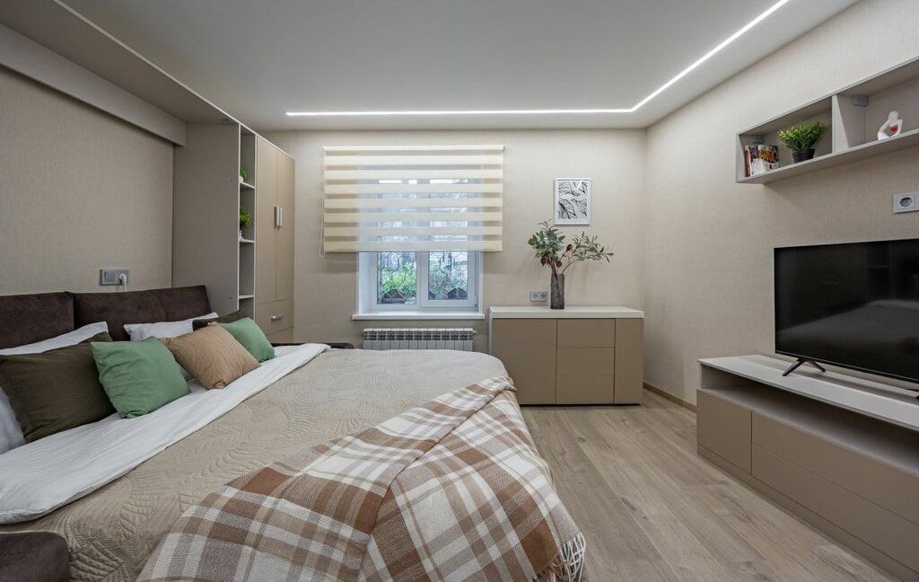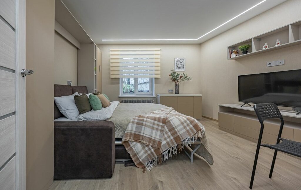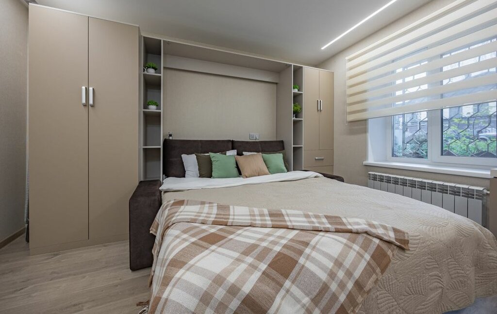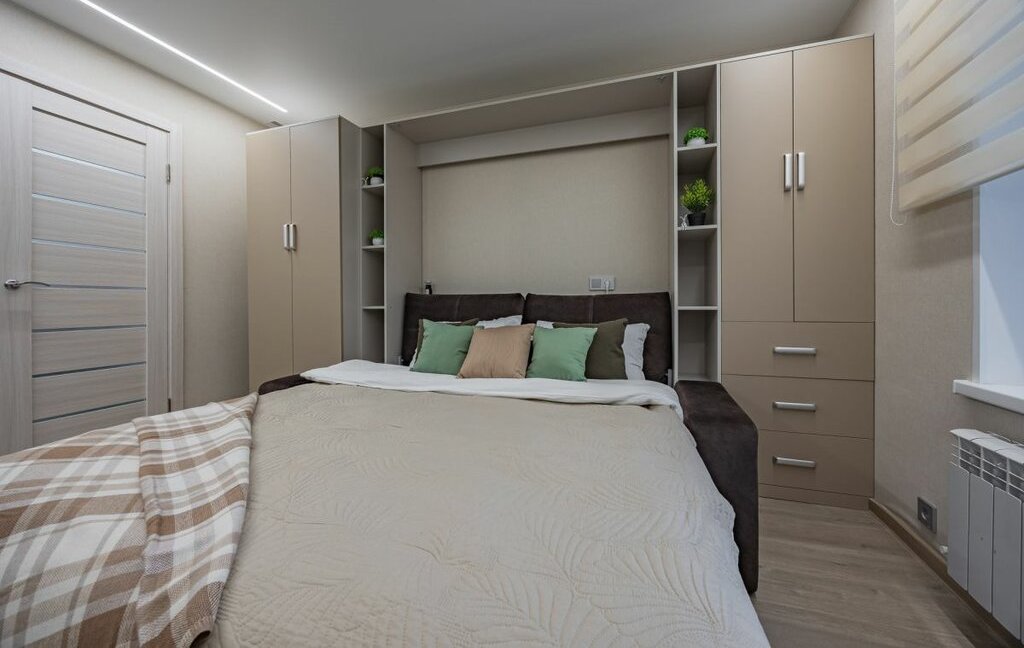 - Несколько функциональных шкафов в комнате, стол-трансформер как рабочее место.