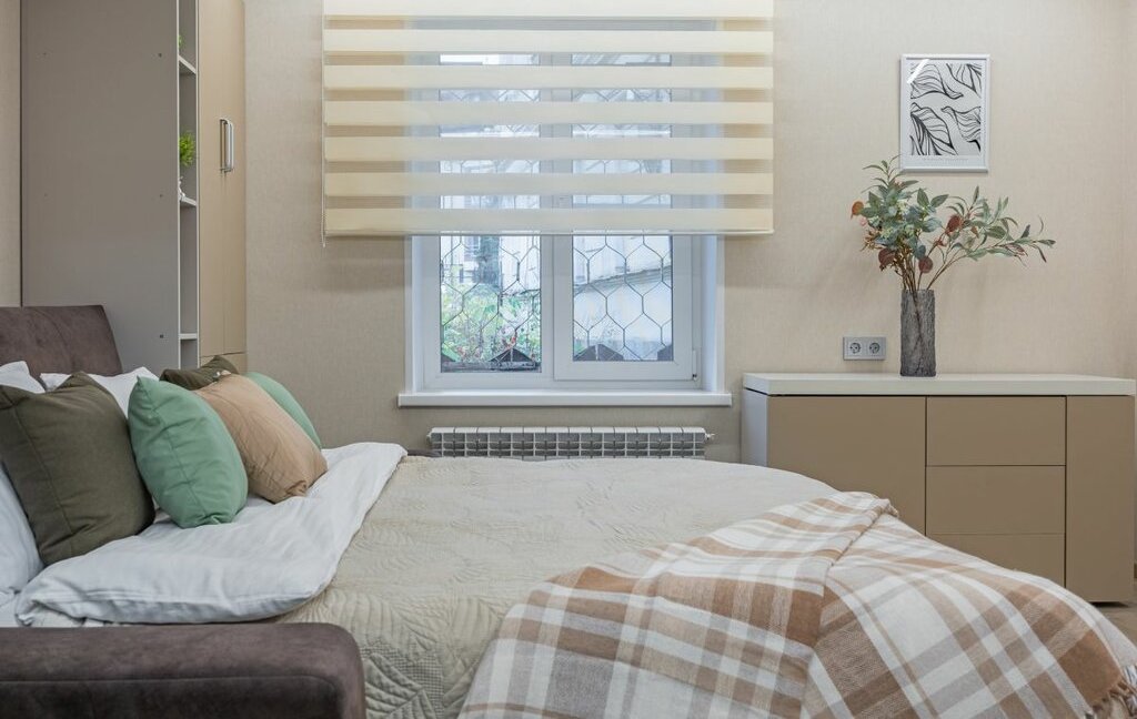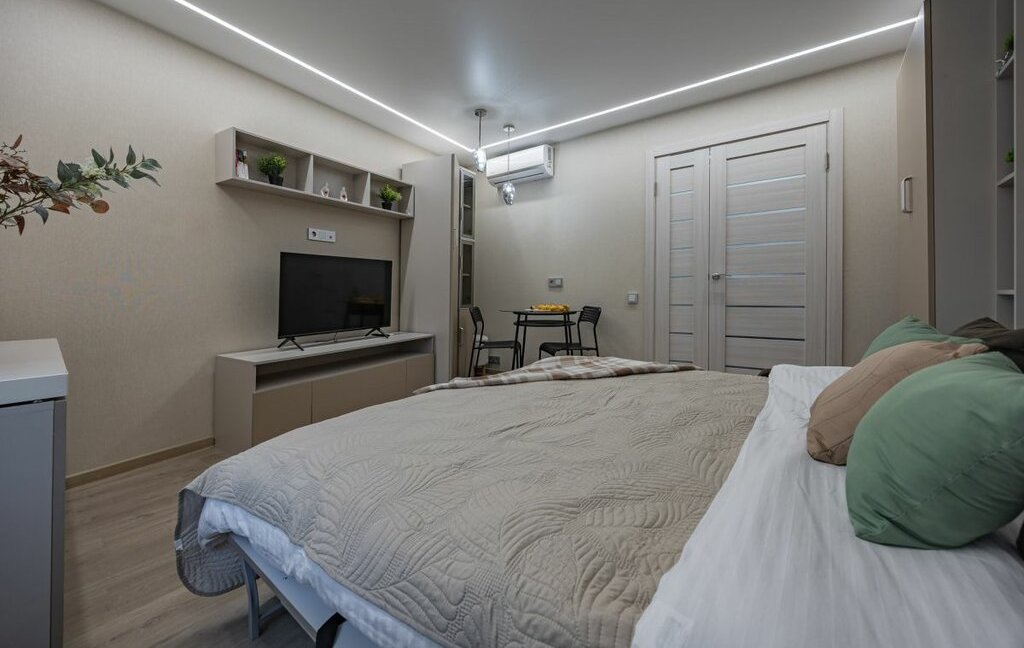 Квартира: Идеально подходит для 1-2 человек — просторная спальня-гостиная с двуспальной кроватью 160×200, своя полноценная кухня, с/у с душевой кабиной. Свежий ремонт, полная комплектация заезжай и живи, индивидуальный котел нагревания: возможность настраивать температуру батарей и горячей воды — всегда тепло!
