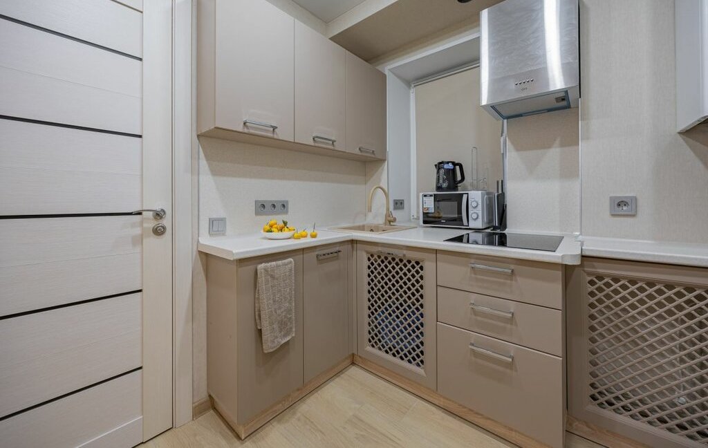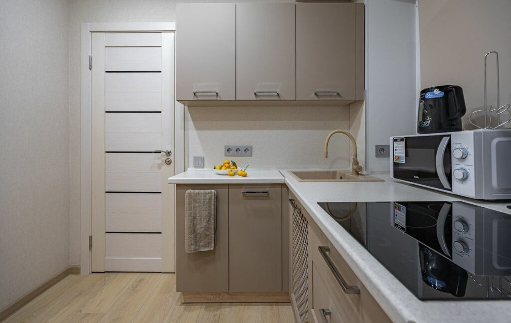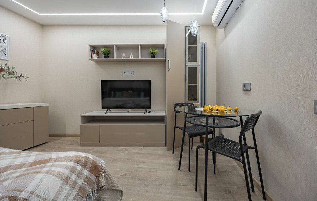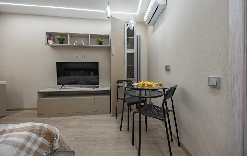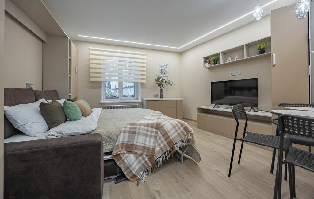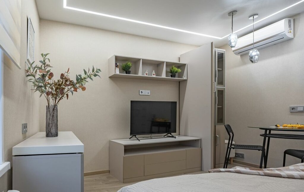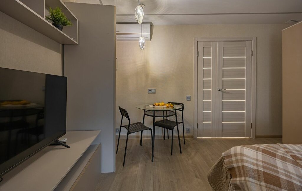 - Однокомнатная студия с укомплектованной кухней и ванной комнатой.