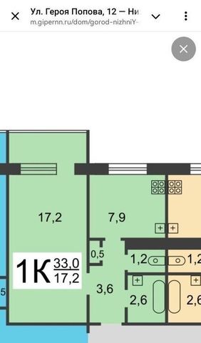 1-комнатная квартира: Нижний Новгород, улица Героя Попова, 12 (33 м²)