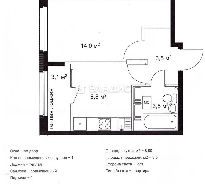 Общая площадь квартиры — 33,6 кв. м, жилая — 14 кв. м, площадь кухни — 8,8 кв. м. Высота потолков — 2,5 м. В квартире есть теплая лоджия, где можно наслаждаться видом и свежим воздухом. Квартира с евроремонтом, комнаты изолированы, санузел совмещённый. Есть вся необходимая мебель и техника.