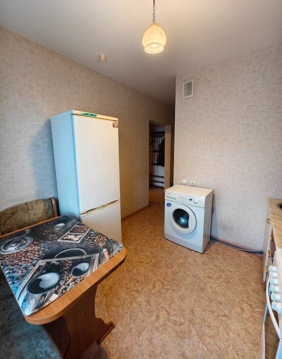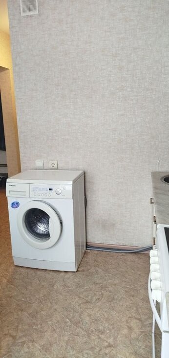 Кухонный гарнитур, стиральная машина-автомат, холодильник, стенка в комнате.