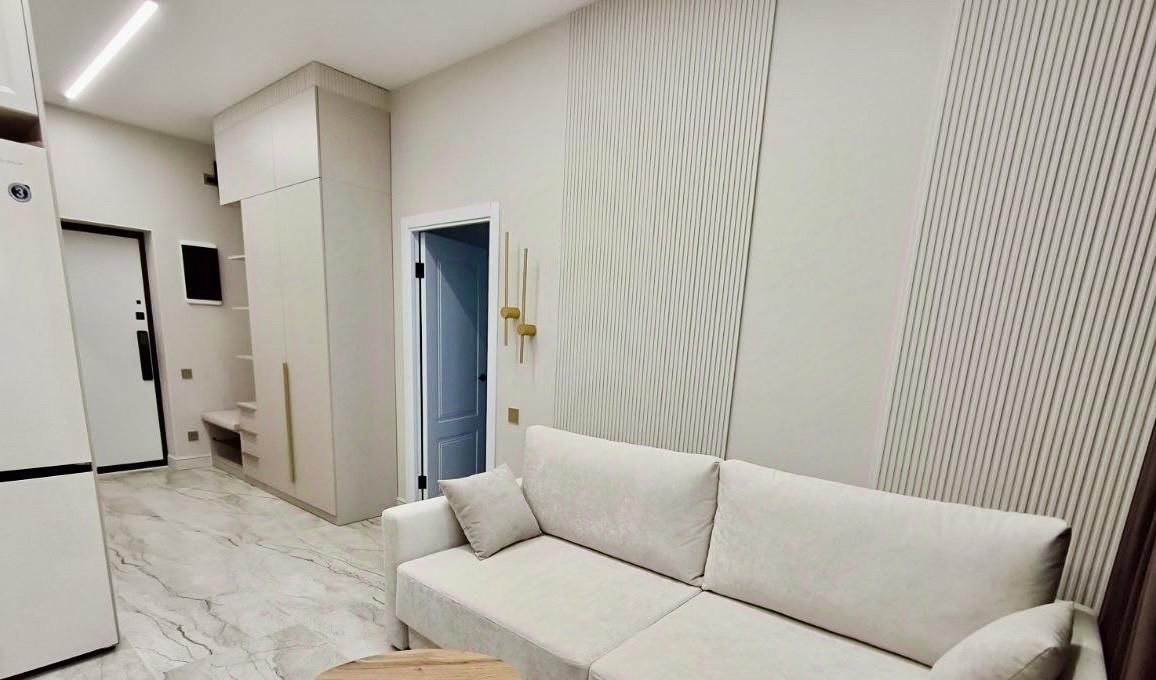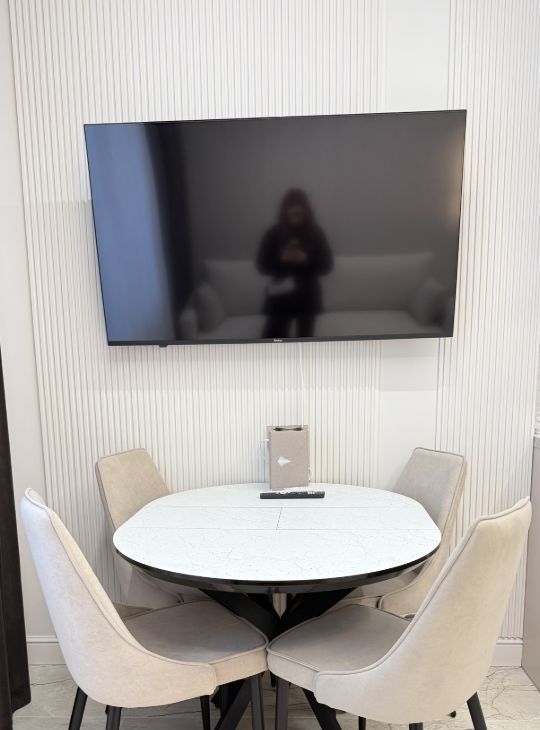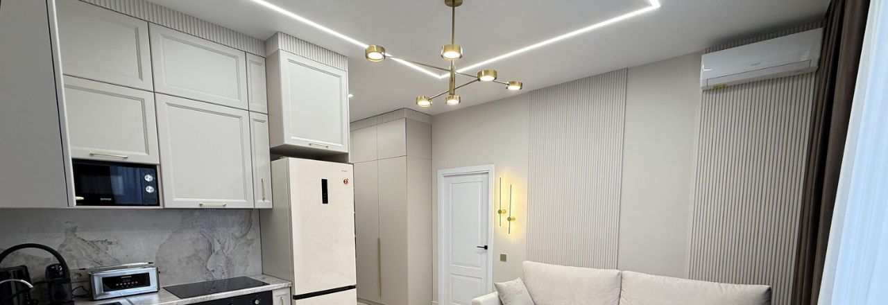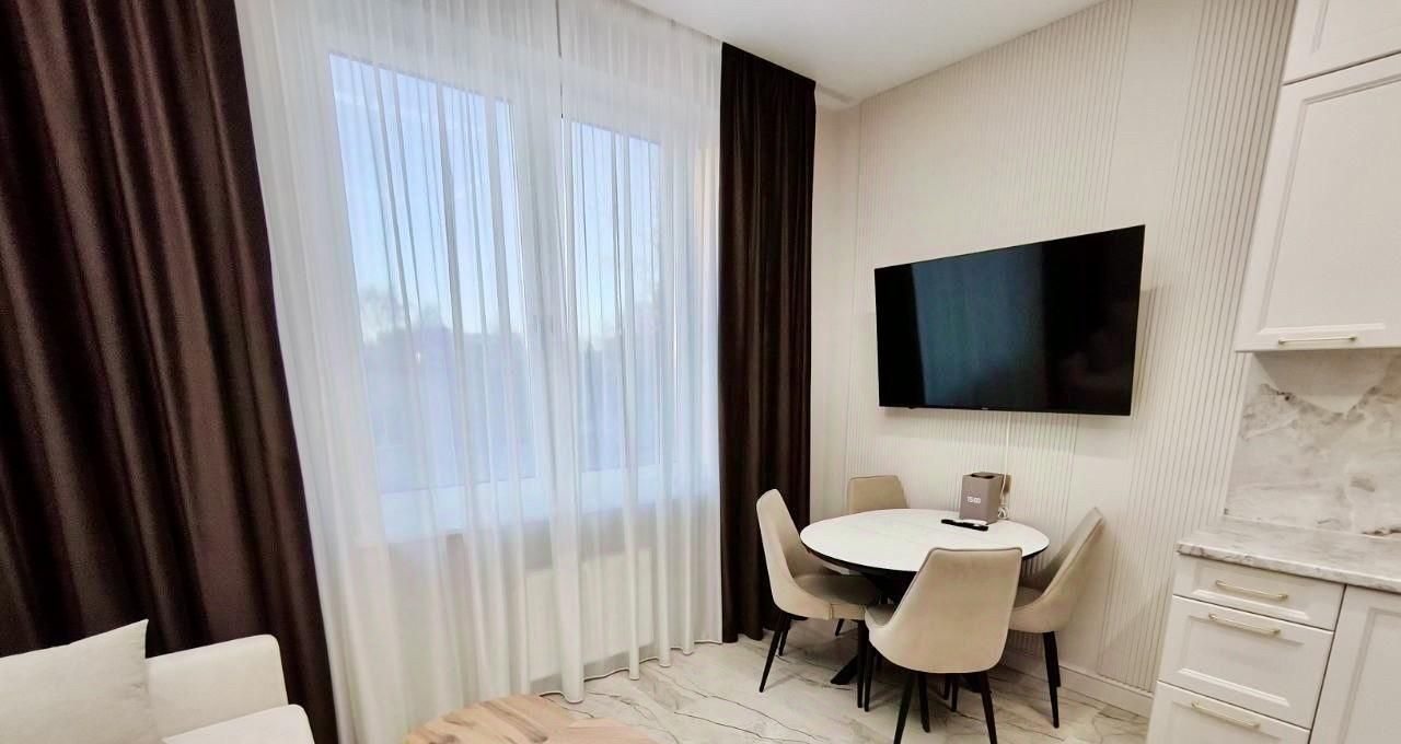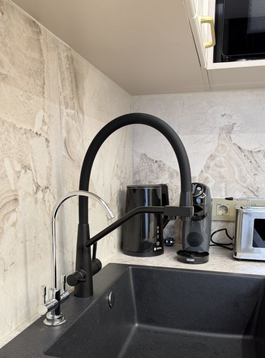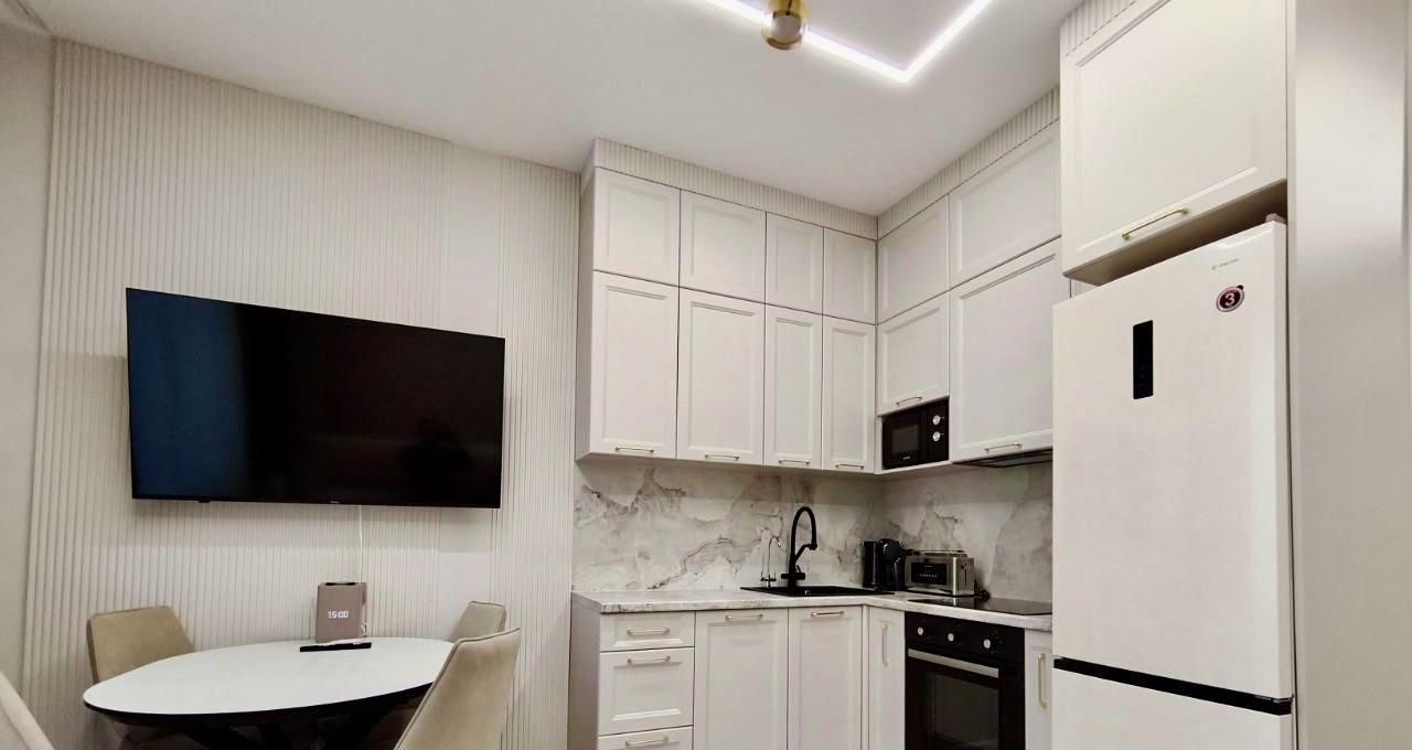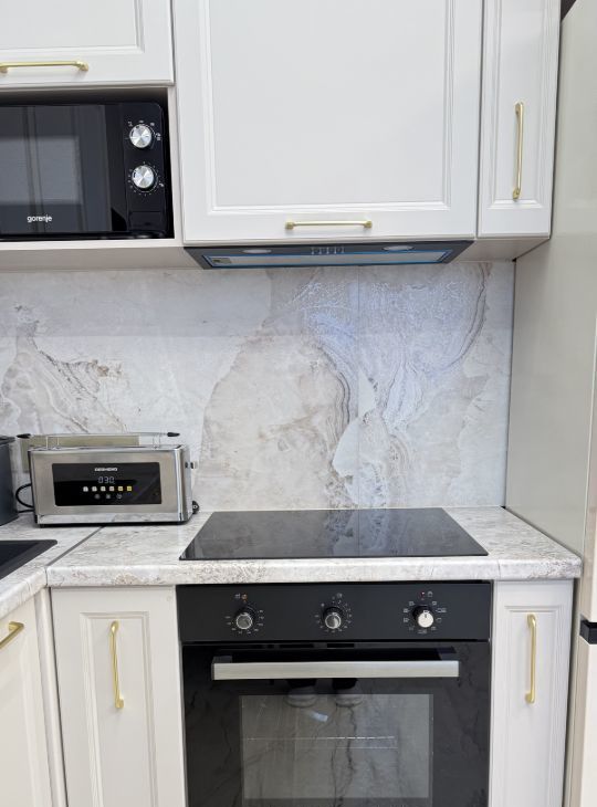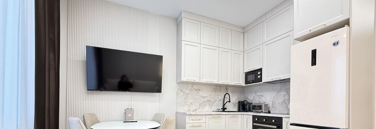 Кухня-гостиная оснащена всей необходимой кухонной техникой: электро плита, духовой шкаф, микроволновка, посудомоечная машина, холодильник, чайник, тостер, капсульная кофемашина. Так же в гостиной раскладной диван, кондиционер, ТВ со смарт-tv и умной колонкой Алиса.