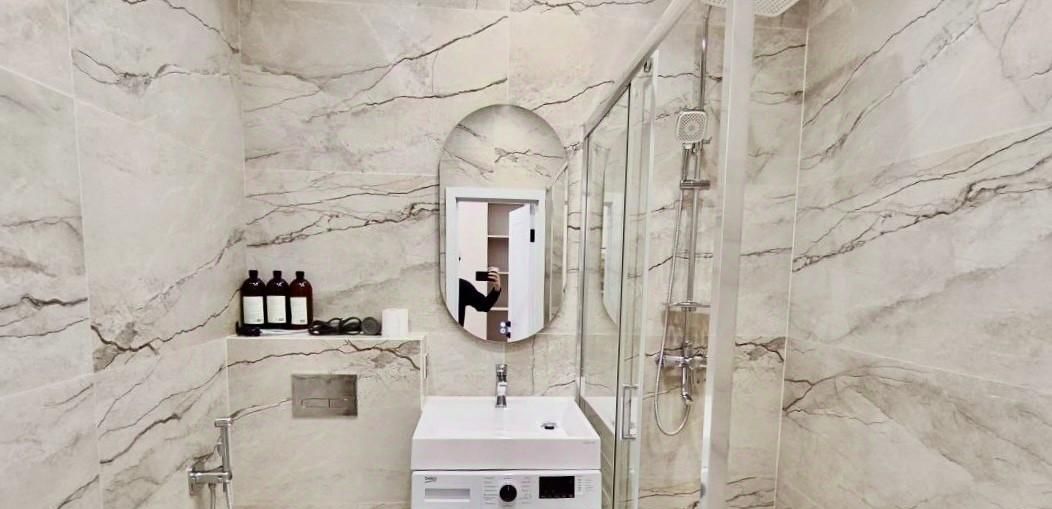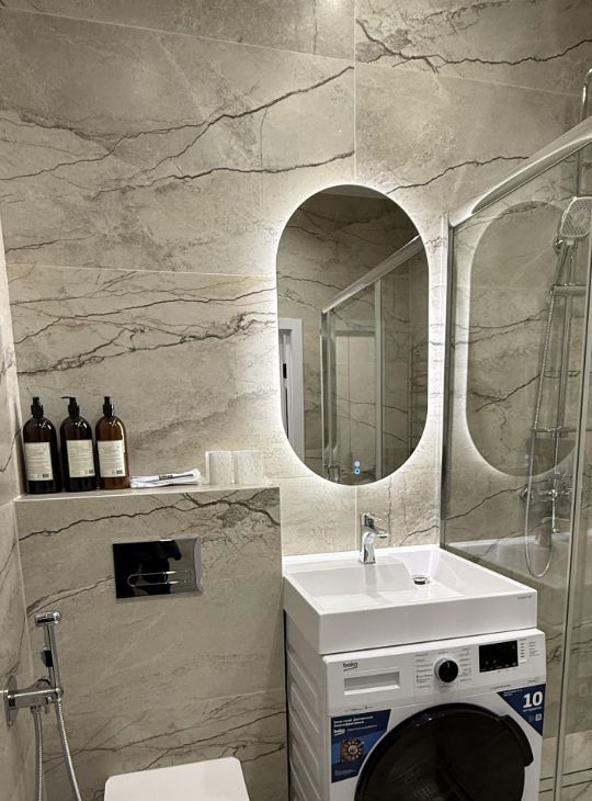 В ванной комнате душ, стиральная машина, зеркало с обогревом от запотевания, фен для волос.