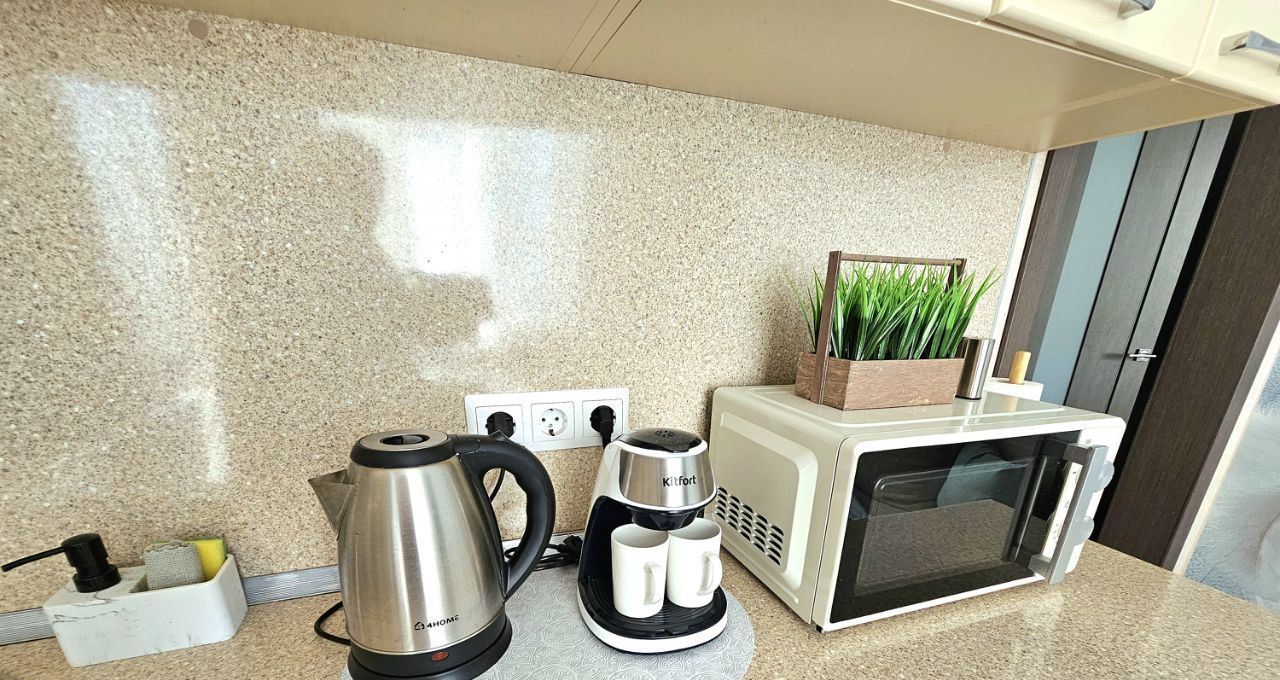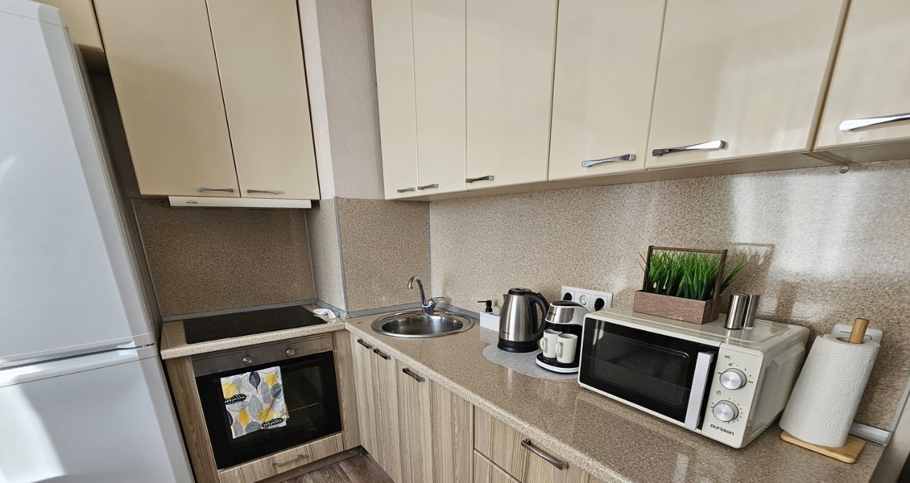 Полностью оборудованная кухня (плита, холодильник, микроволновка, чайник, посуда)