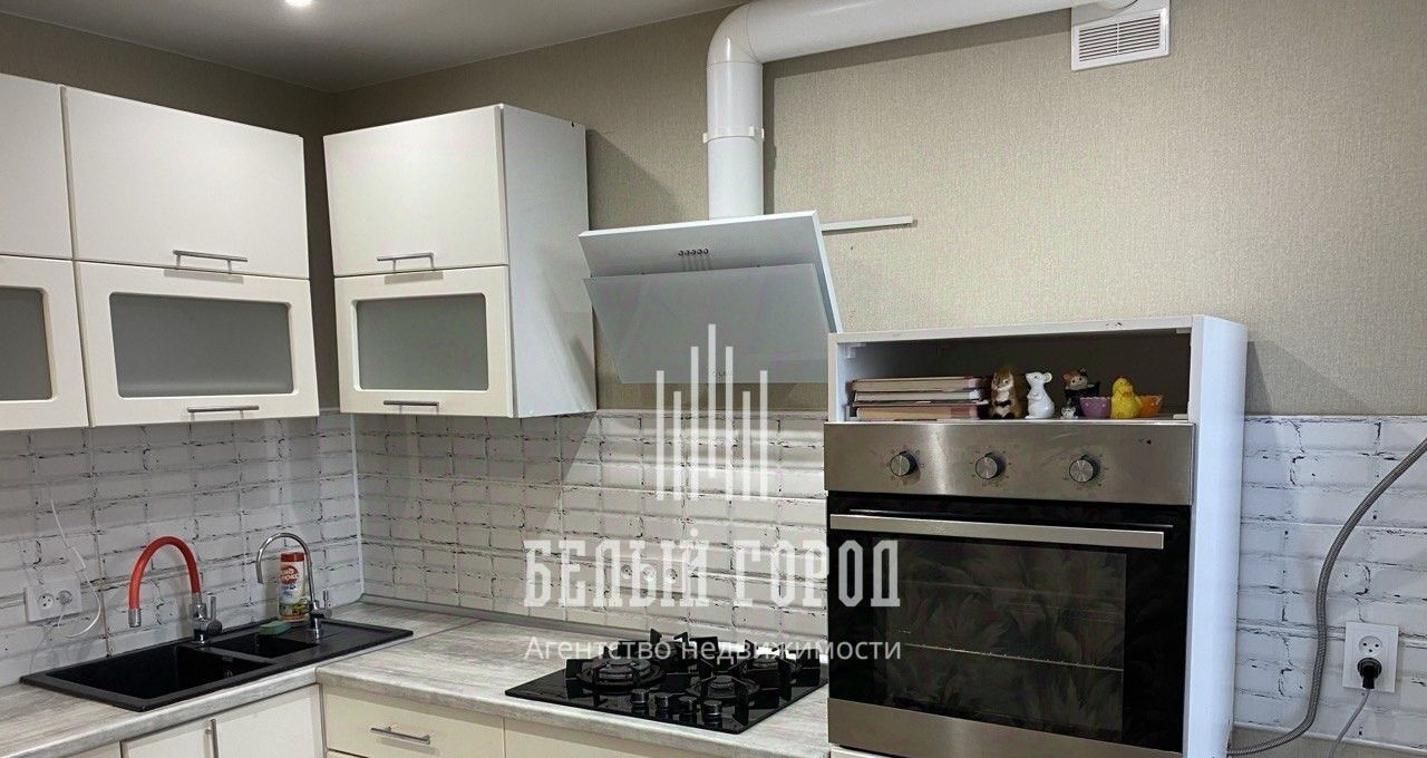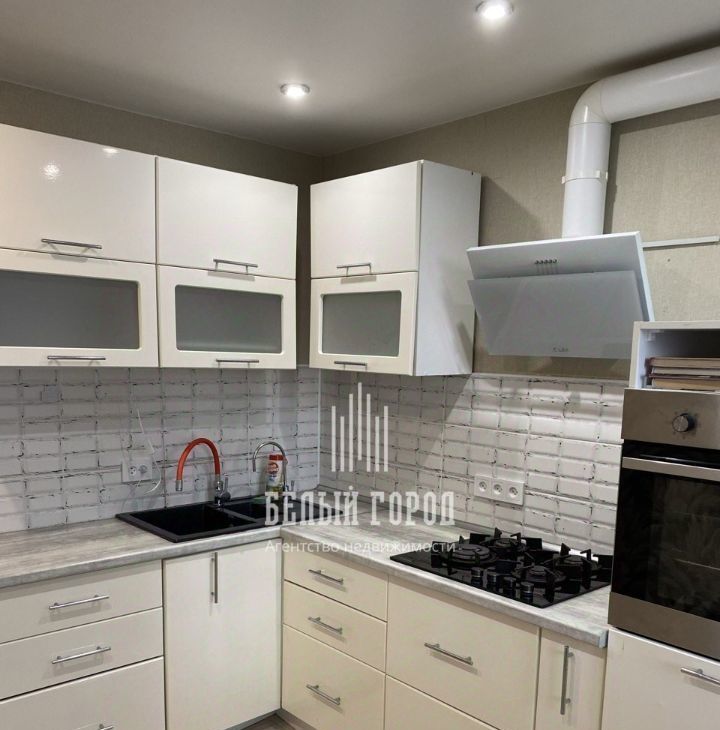На кухне установлен современный, функциональный кухонный гарнитур с надежной бытовой техникой (варочная панель, встроенный духовой шкаф, современная вытяжка).