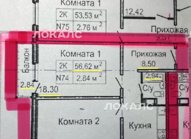 2 комнаты по 18,3 м2, кухня 8,58 м2, прихожая 8,5 м2, балкон 2,84 м2, с/у 2,94 м2