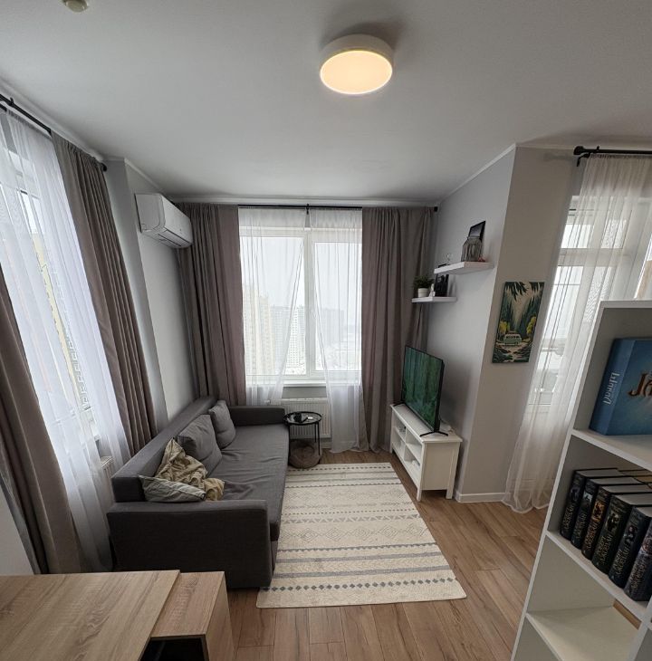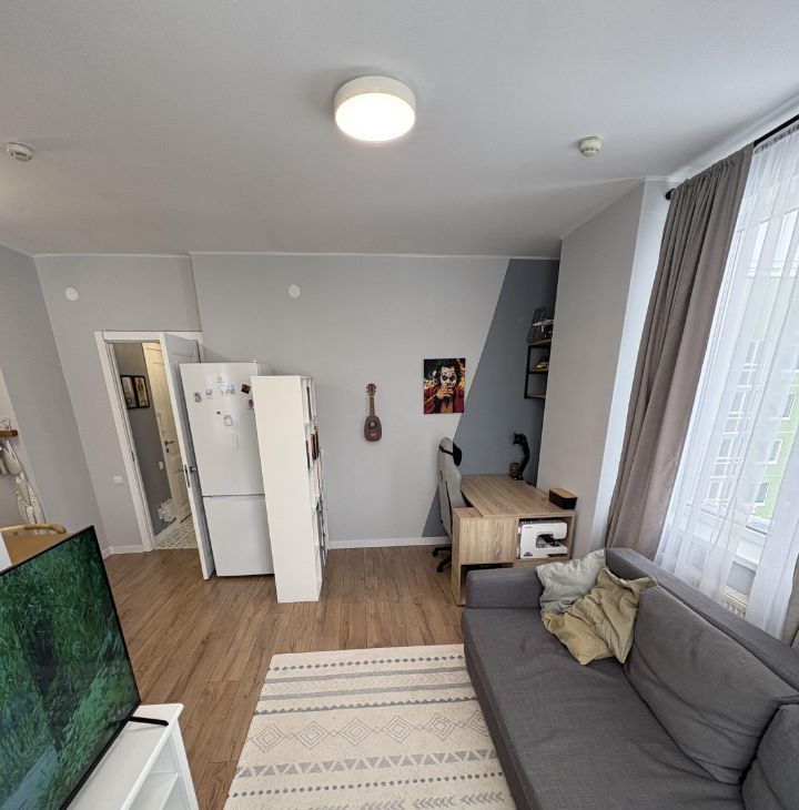 Кухня-гостиная функционально разделена на 3 зоны: зона кухни, ТВ-зона и рабочее место. В комнате 3 окна, что обеспечивает большое количество света. Окна выходят на юго-восток, летом в квартире очень много солнечного света. Для особо жарких дней установлен кондиционер, обслужен в 2025 году.