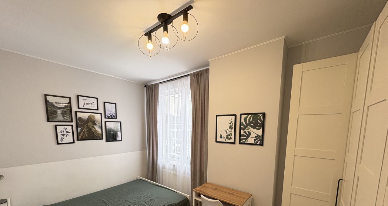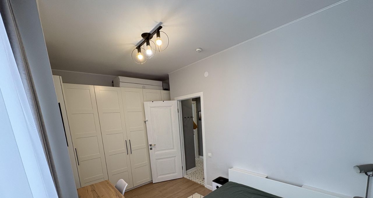 Квартира очень светлая, чистая. В спальной размещена кровать 160*200 с ортопедическим матрасом, 3х метровый шкаф Икеа и компактное рабочее место.