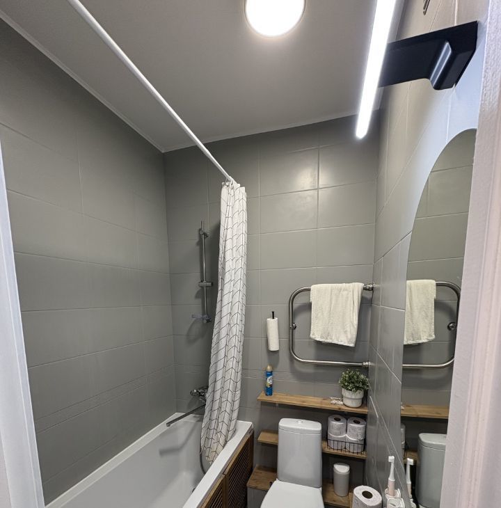 В конце 2024 установлена новая кухня, фасады в эмали, встроенная техника (плита, духовка, посудомойка, стиралка), встроенная подсветка столешницы с сенсорным датчиком, смеситель с гибким изливом и подключенным проточным фильтром для питьевой воды. В обеденной зоне новый стол из массива в шпоне дуба (80*70, в разложенном состоянии 120*70) и стулья из массива березы.