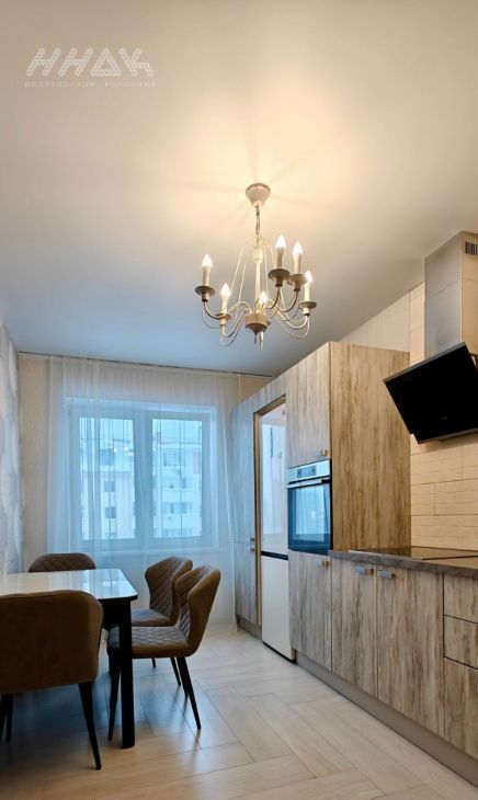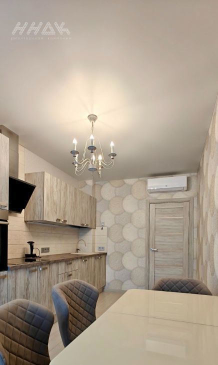 * на кухне: современный кухонный гарнитур с встроенной техникой: варочная панель, духовой шкаф, вытяжка, посудомоечная машина, холодильник, обеденный стол со стульями, кондиционер