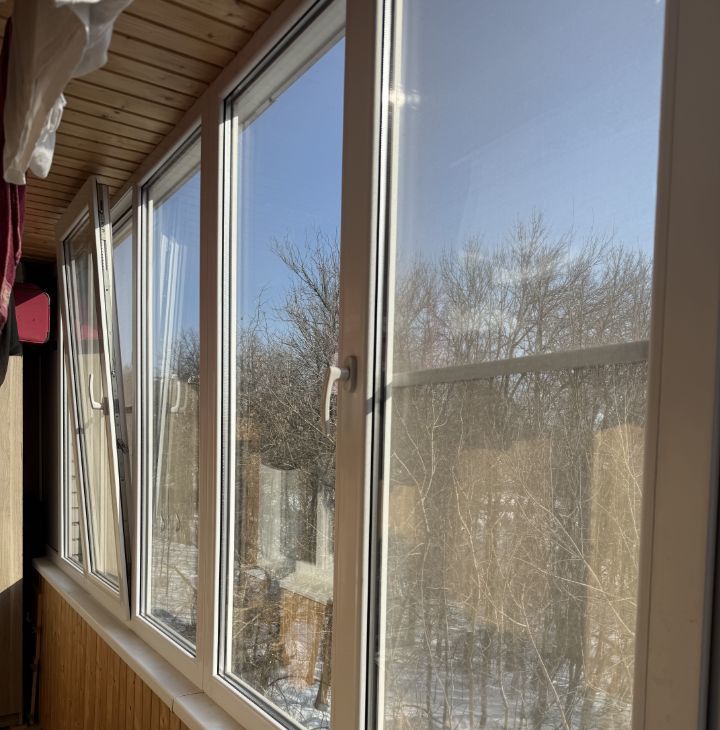 Большая лоджия с видом на лес. Установлены пластиковые окна в комнатах и на лоджии.