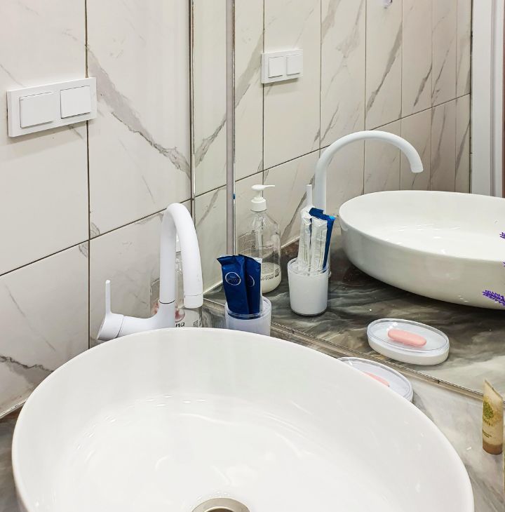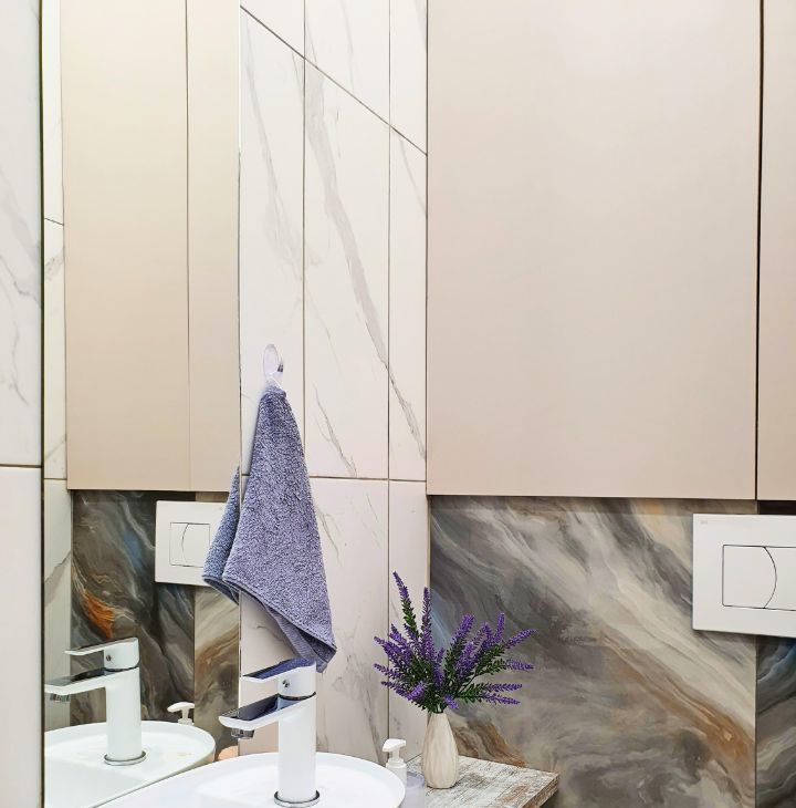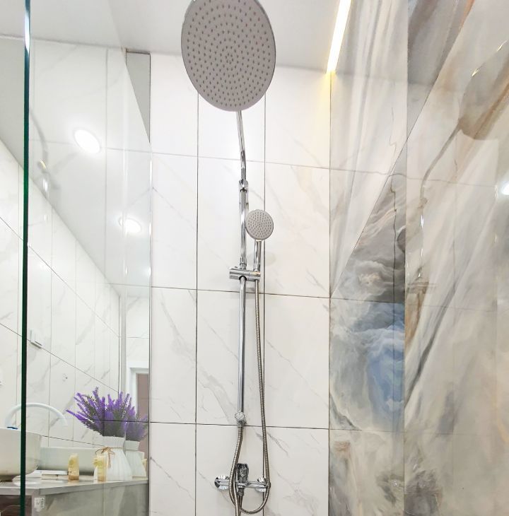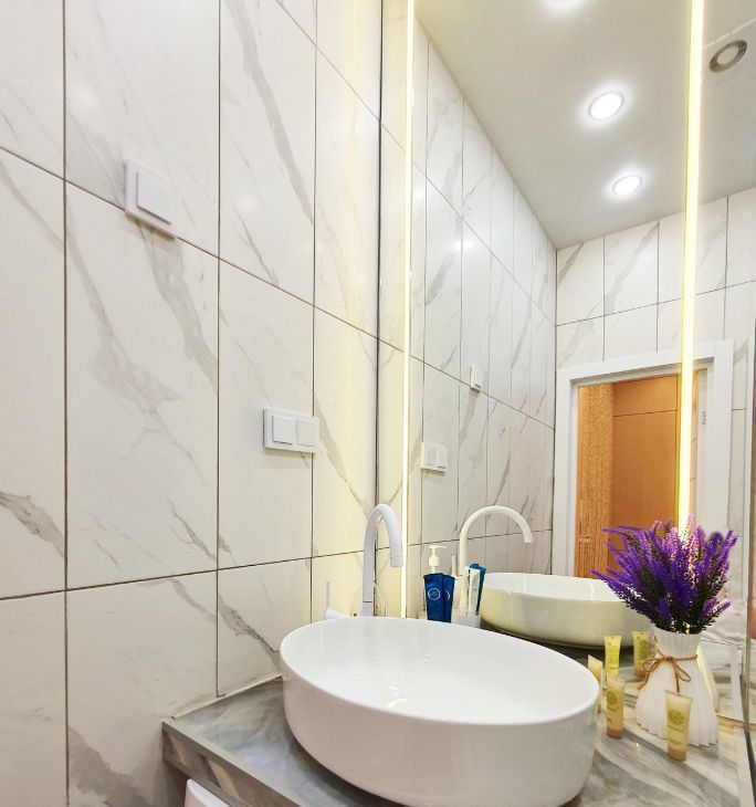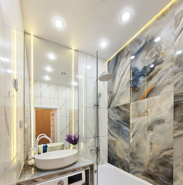 > Раздельный санузел, отделка керамогранит, качественная сантехника и санфаянс + декоративная подсветка + бойлер.