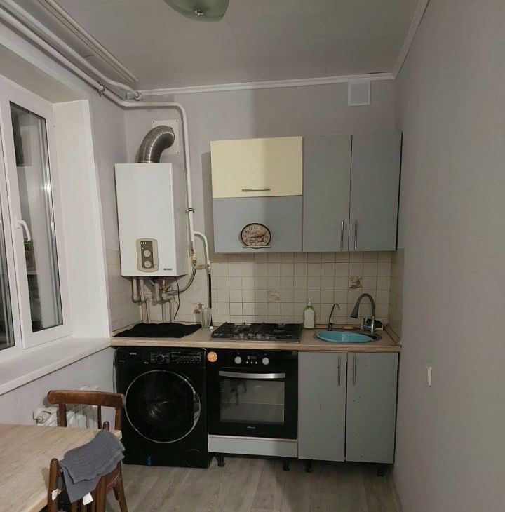 Квартира со свежим ремонтом. На кухне есть необходимая мебель, а также стиральная машина.